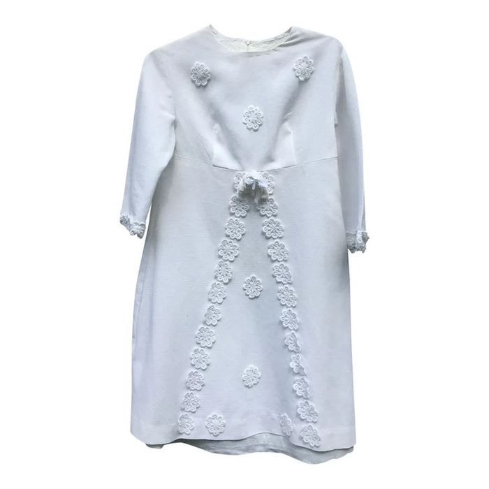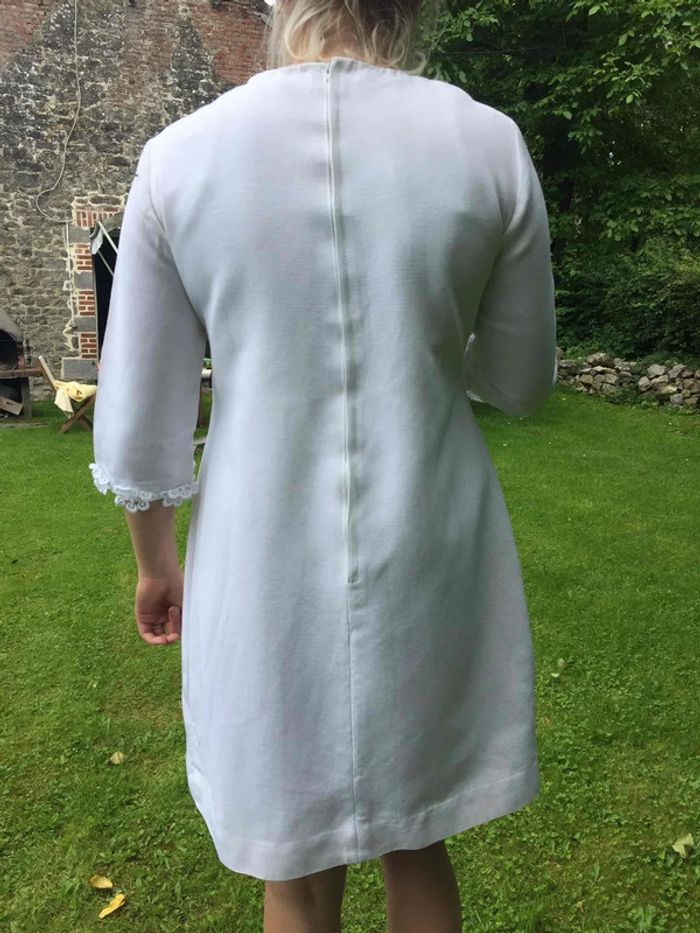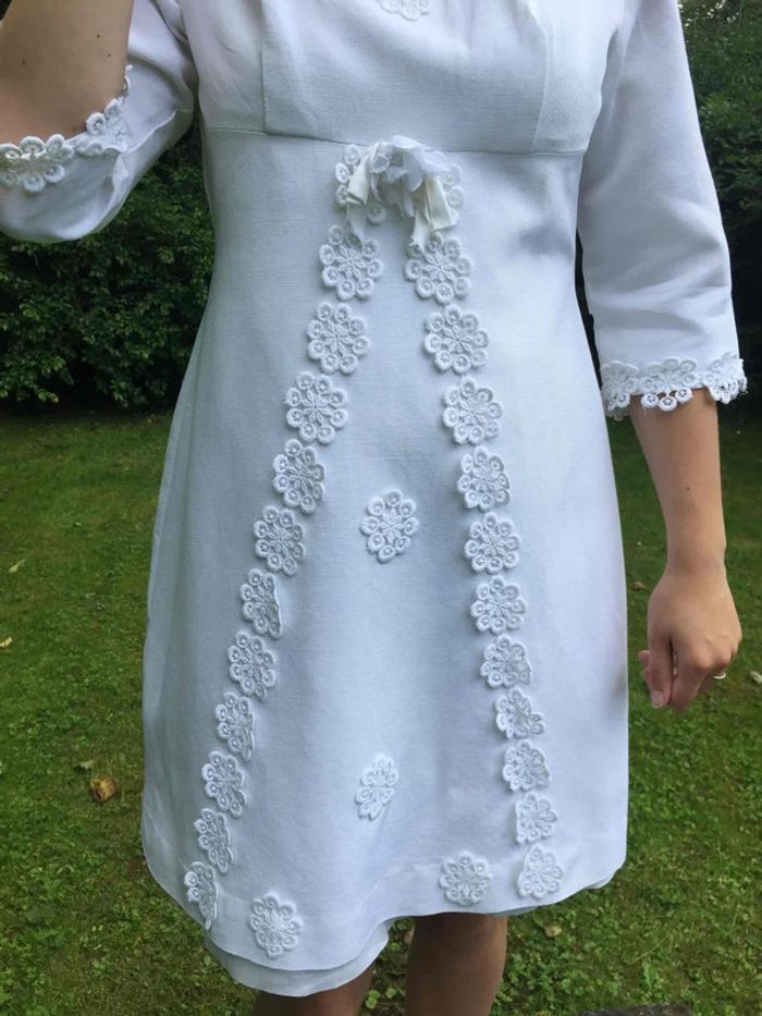 magnifique robe entièrement conçue et cousue par ma maman dans les années 70 pour le mariage de sa sœur coton épais et décorations fleurs au crochet doublure intérieure en coton plus fin La doublure dépasse un peu de la robe manches 3/4 avec fleurs au crochet glissière au dos modèle UNIQUE très bon état général... juste une petite tâche tout en bas de la robe ... voir dernière photo, facile à camoufler convient du 34 au 40 la modèle sur les photos porte du 36/S épaules à plat : 41 cm aisselles : 49 cm hanches : 55 cm Longueur : 91 cm. 95cm avec la doublure taille des manches : 40cm