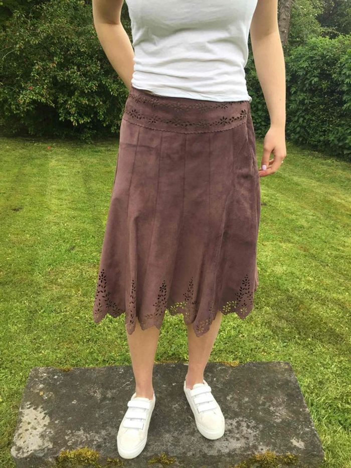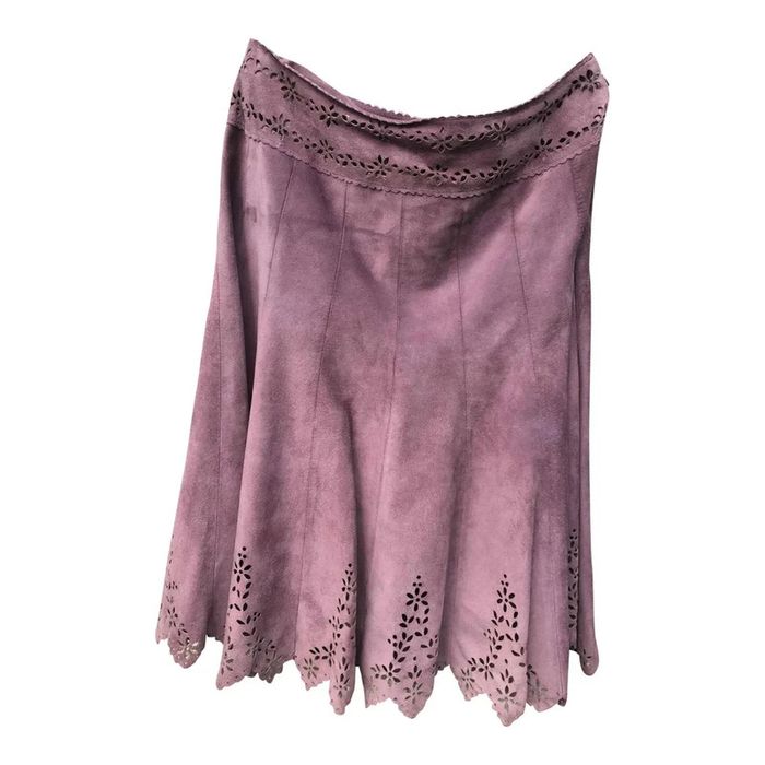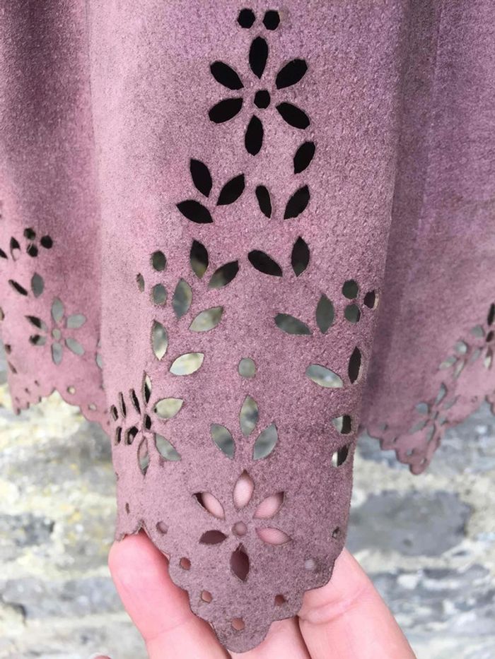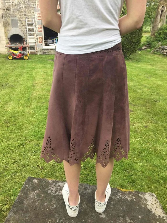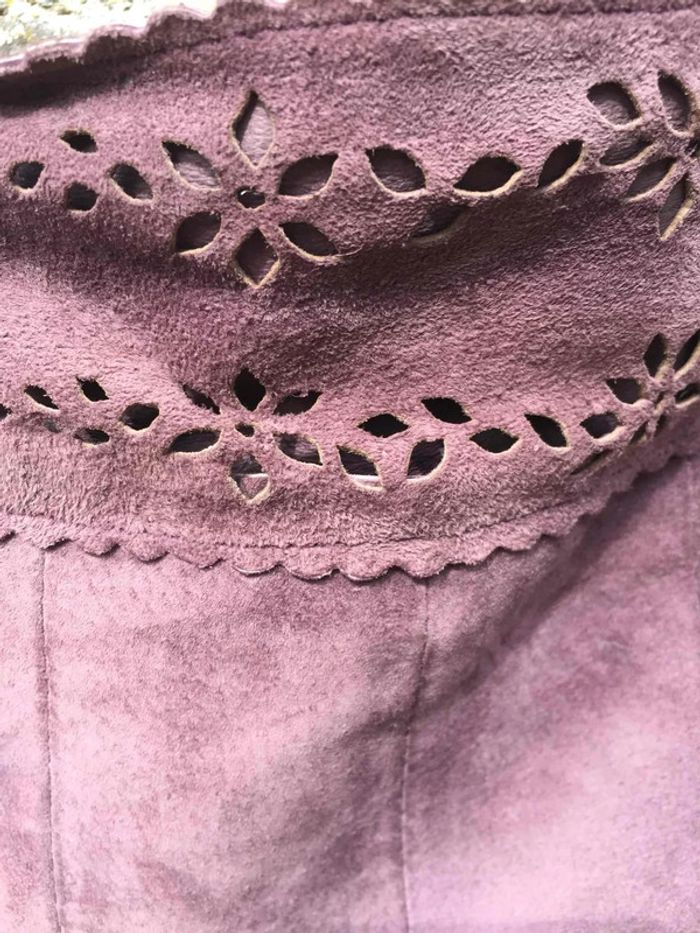 Sublime jupe bohème en peau. Coupe évasée avec motif fleurs ajourés en bas et à la taille. Glissière sur le côté. Entièrement doublée. Taille 2 correspond à 40 / 42 mais vérifier vos mesures : taille à plat : 40 cm. longueur : 61 cm. Excellent état