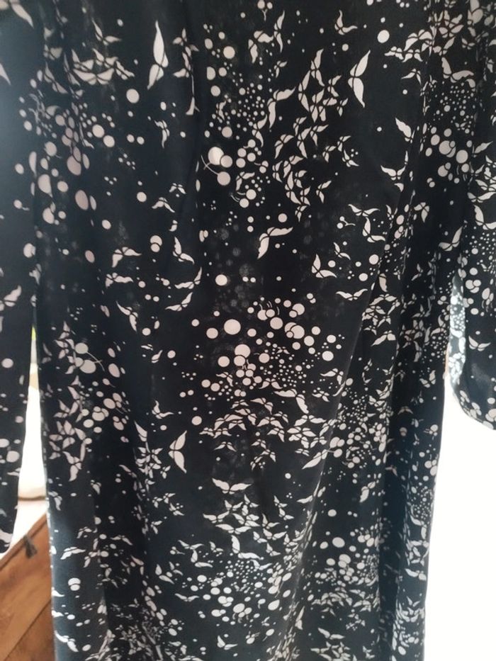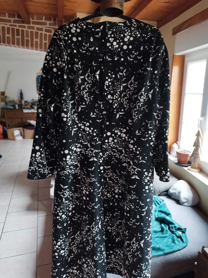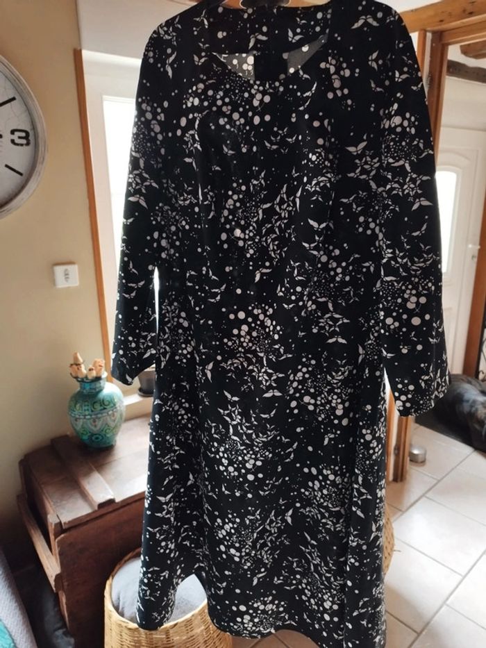 Entièrement conçue et cousue par ma maman dans les années 70, cette jolie robe est un modèle unique.. Longue glissière au dos Tissu synthétique Manches 3/4 Taille unique, convient jusqu'au 46, vérifiez vos mesures Épaules : 40cm Aisselles : 50cm Taille : 50cm Hanches : 56 cm Longueur : 109cm