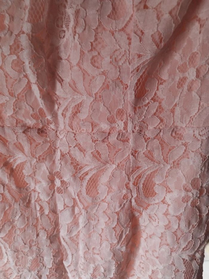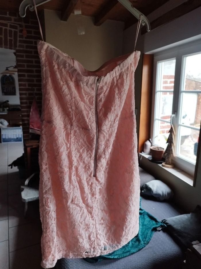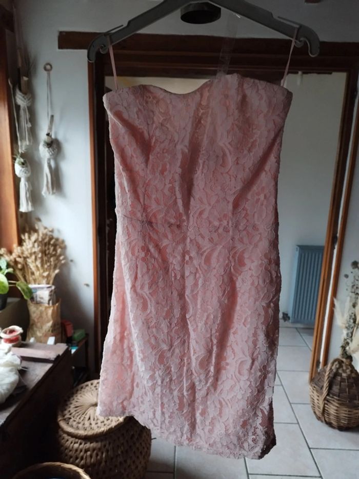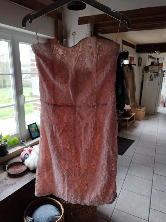 Jolie petite robe "dentelle" sans bretelles Glissière au dos Bande agrippante à la poitrine Jolie couleur rose pâle Entièrement doublée 70% coton. 30% polyamide En excellent état Taille S