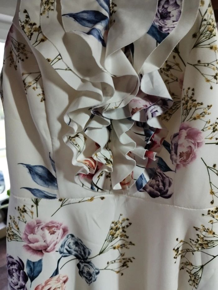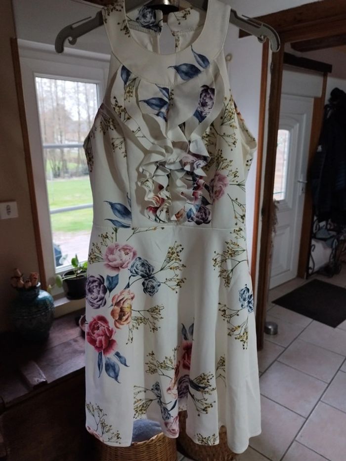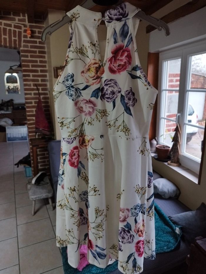 Sublime robe d'été aux emmanchures américaines Magnifiques motifs fleurs sur fond blanc Jolis froufrous au niveau du col, ultra féminin Un bouton au dos Coques en mousse au niveau de la poitrine 95% polyester. 5% elasthane Très bon état Taille XS