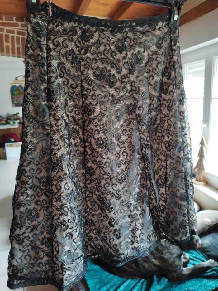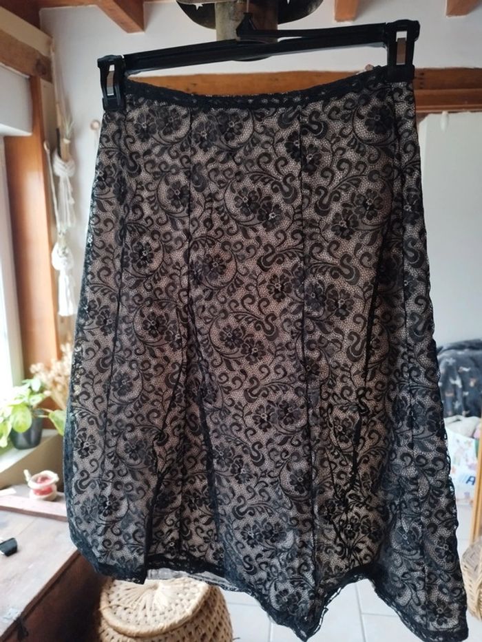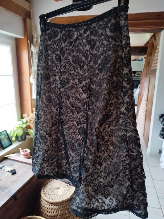 Entièrement conçue et cousue par ma maman dans les années 80 cette petite jupe est absolument divine !! Esprit très rock avec sa dentelle cousue sur un jupon Glissière sur le côté Longueur 63 cm Très bon état Taille 36 ATTENTION : ce modèle unique est relativement transparent... à porter sur un short