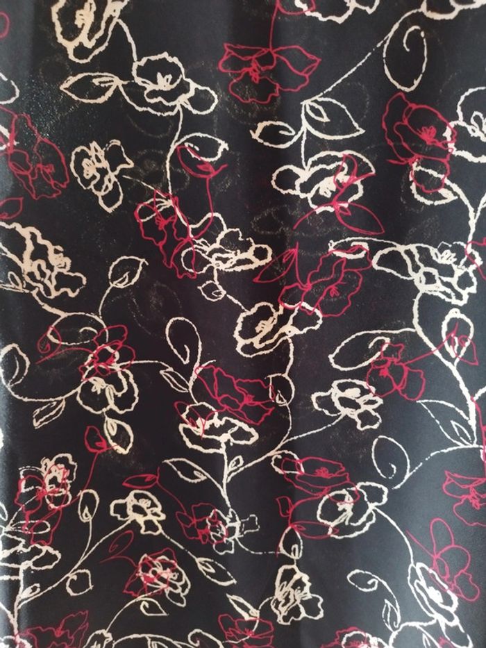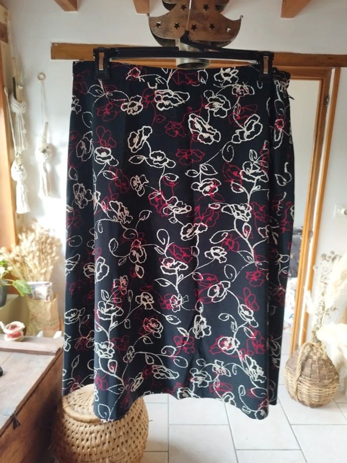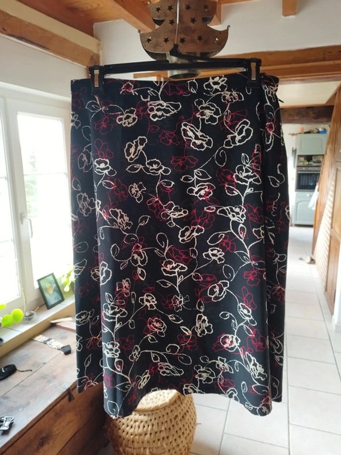 Jolie jupe noire avec motifs rouge et blanc Coupe évasée très féminine Bouton + glissière sur le côté Pas d'étiquette pour le tissu, je pense coton et polyester Longueur 74cm Taille 40