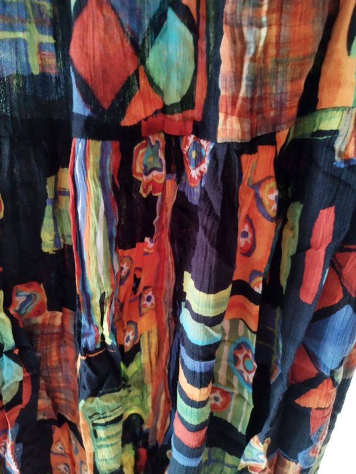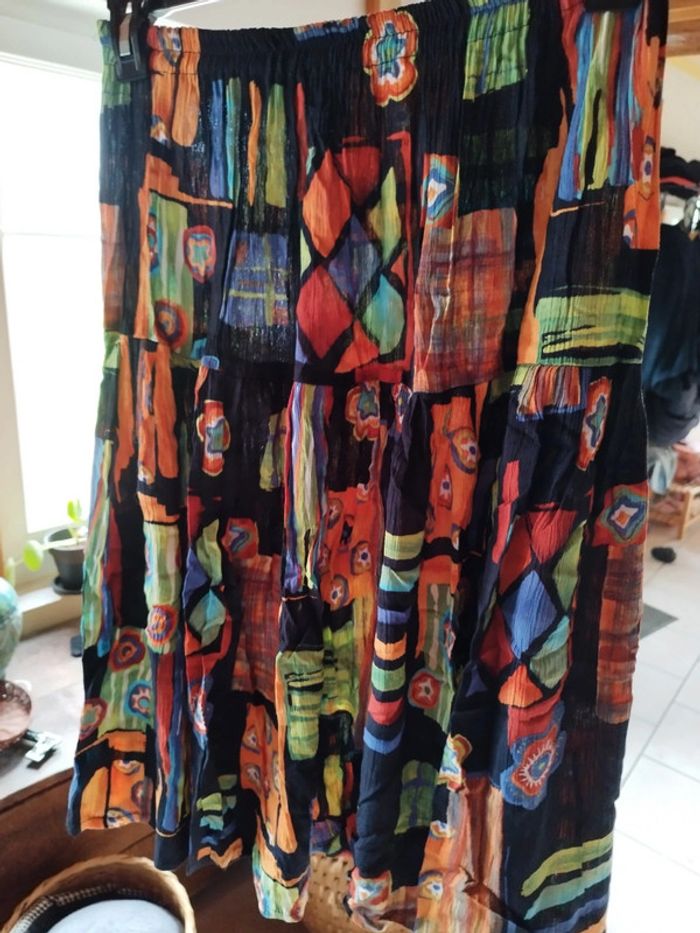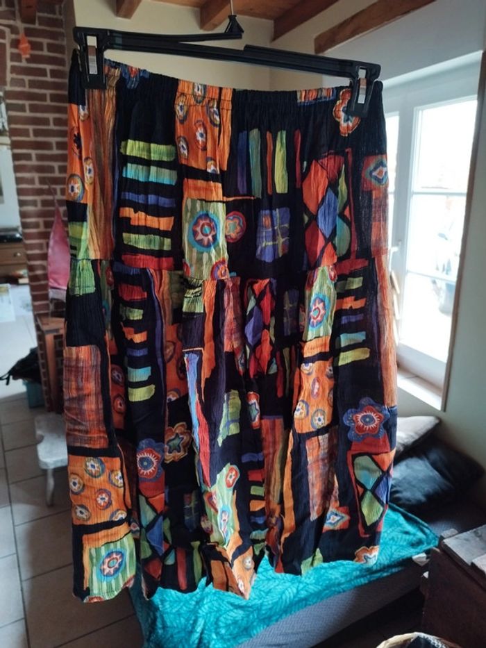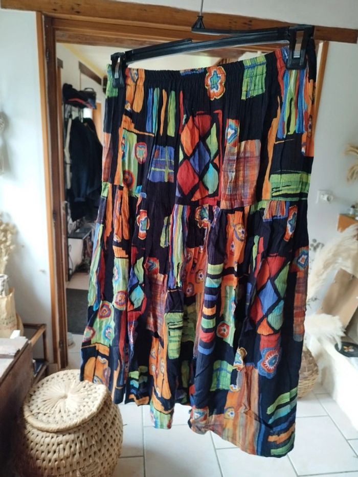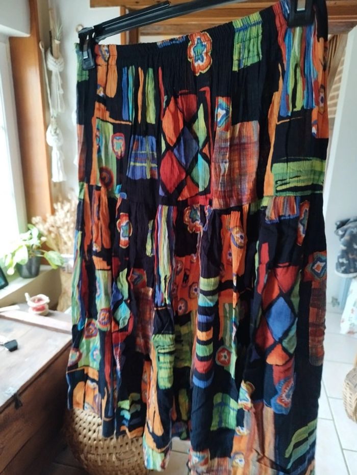 Jolie jupe tissu froissé 100% viscose Idéale pour un look bohème Motifs très colorés (bleu, vert, orange)sur fond noir Taille élastique jusqu'à 54cm Longueur 70cm Excellent état Convient du 36 au 42