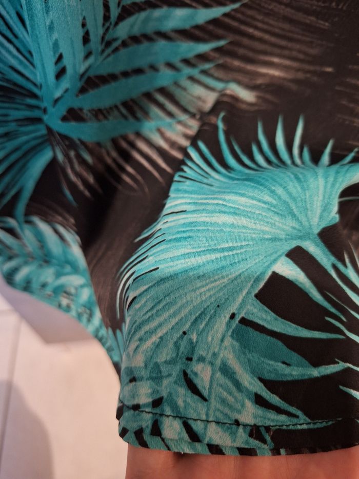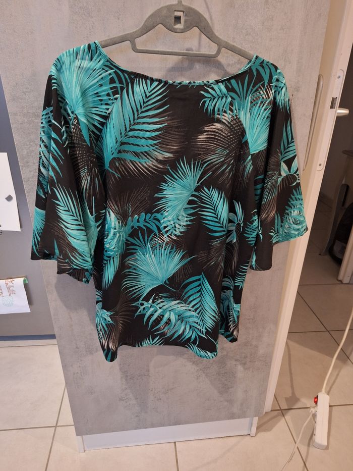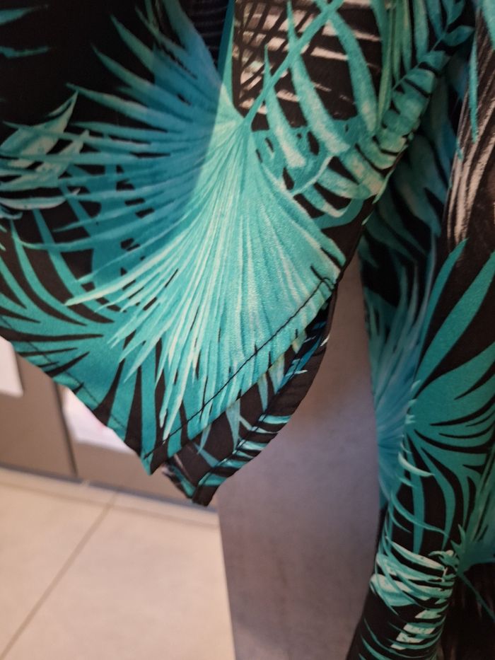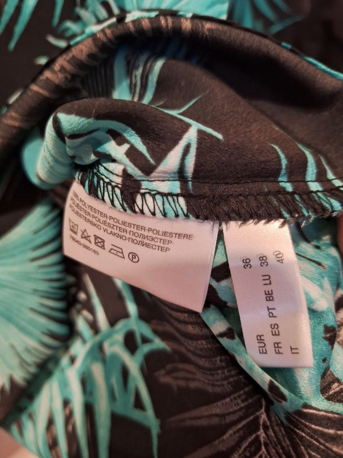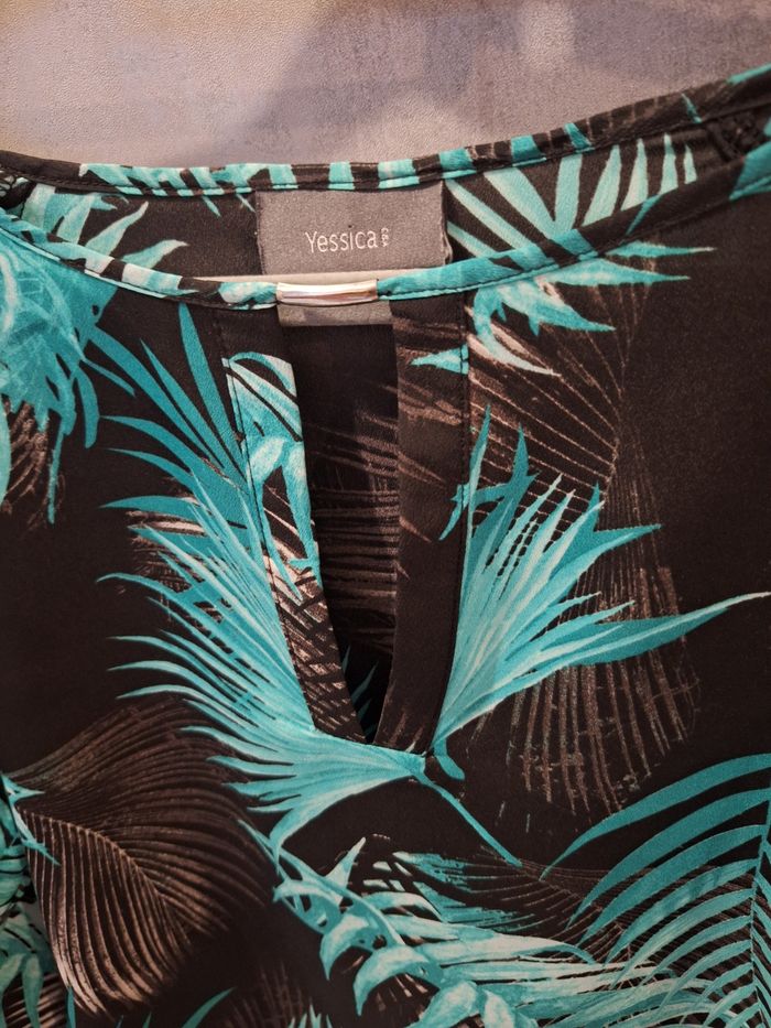 Bonjour ✴️Je vend cette blouse en très bon etat ✴️Cette blouse possède une encolure ronde avec léger décolleté de 14cm de longueur fermé avec un bout de métal ✴️De la marque C&A ✴️100% ✴️Couleur vert/ bleu et noir imprimé feuilles ✴️Léger et agréable à porter ✴️Longueur du vêtement: 67cm depuis les épaules ✴️Largeur d'épaules 40cm et 50cm d'aisselles