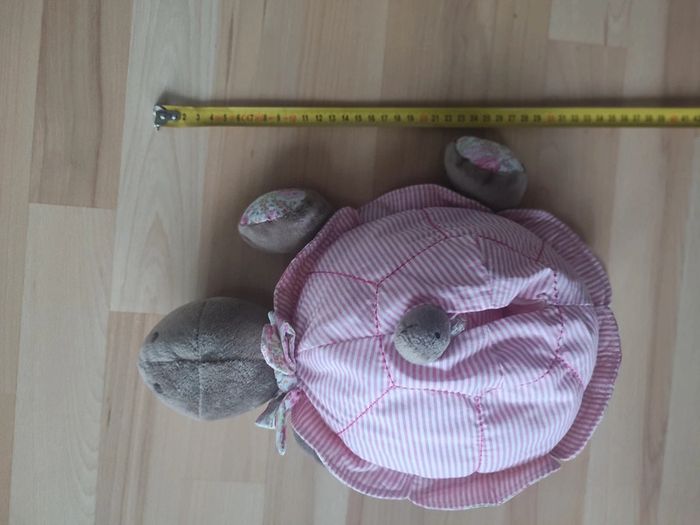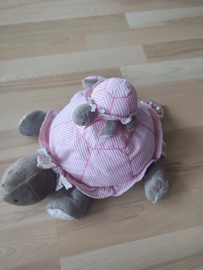 Peluche tortue JACADI d'activités Promenade au parc Dimensions : longueur 35 cm environ  La peluche tortue se pare d'un empiècement Liberty et de rayures.  Surprises cachées à l'intérieur de sa carapace : mini-tortue hochet grelot