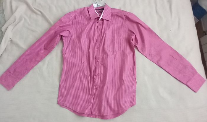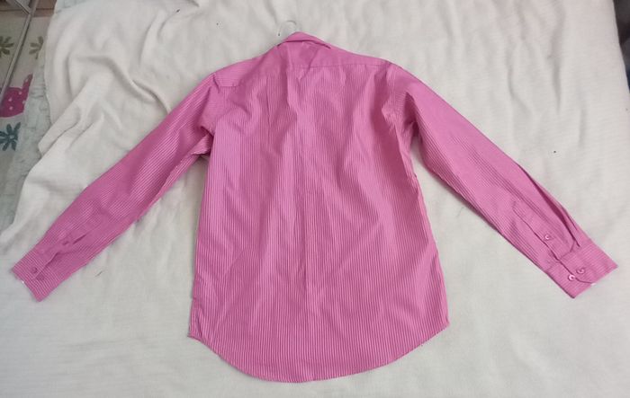 Coupe regular, manches longues avec boutonnage, col, tissu imprimé à rayures de coloris rose et rayures blanches, 1 poche, boutonnage (2 boutons supplémentaires), bas arrondi, composition 60% coton 40% Polyester