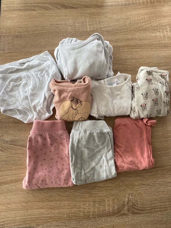 3 pantalons 3 bodies 1 tee shirt 1 sweat disney 2 culottes boomers 1 pyjama coton disney (manque 1 pression d’origine)