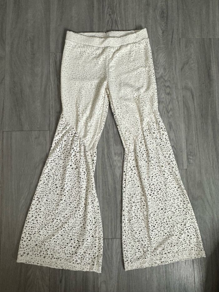 Pantalon ajouré flare - Excellent état - Taille 38 équivalent M - Beige crème - Coupe flare esprit seventies - Élastique à la taille - Doublure intérieure jusqu'aux genoux - Clockhouse C&A - Polyester, viscose et élastane