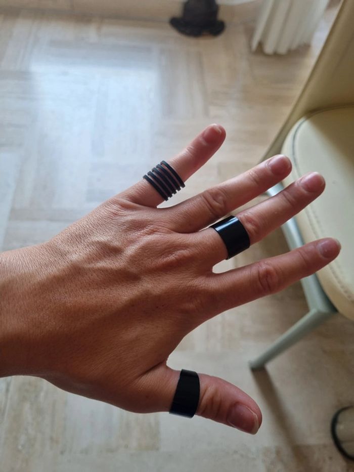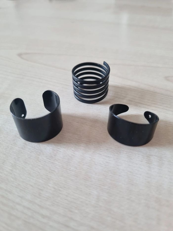 Bonjour 3 bagues noires en "fer" ajustables Totalement neuve, n'ont jamais été portées Si vous avez des questions n'hésitez pas