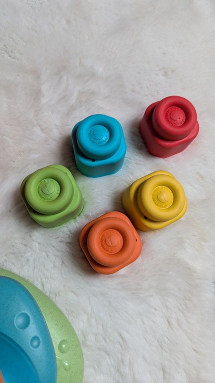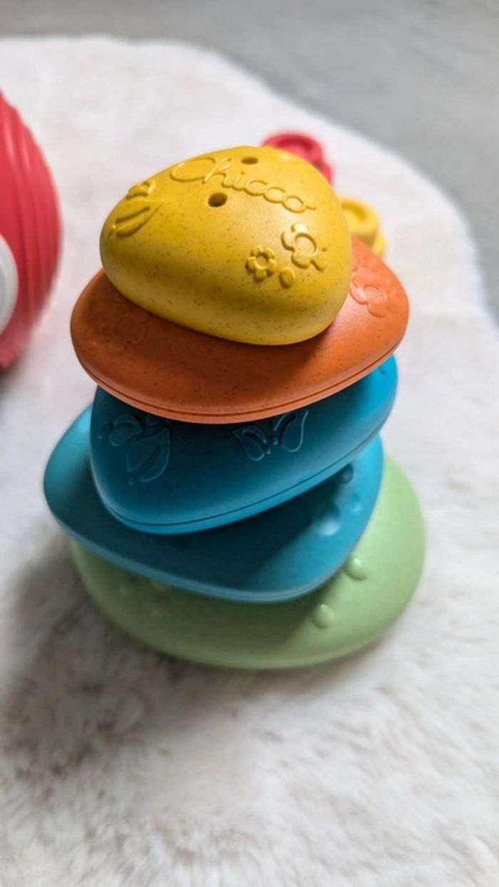 Une balle à trou pour y cacher des cubes empilables marque Clémentoni Une tour de cailloux en plastique recyclé à 80% marque Chicco