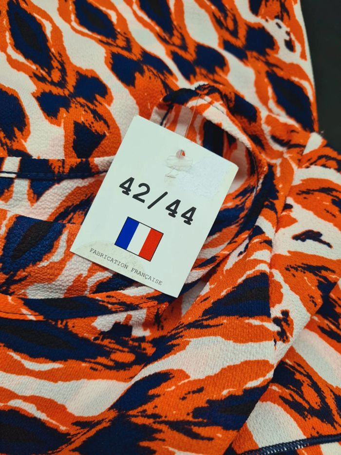 Sans marque apparente Taille 42/44 Épaule à Épaule 42 cms Largeur sous aisselles 50 Hauteur 70 Orange/ Marine Polyester, / elastan Jamais portée