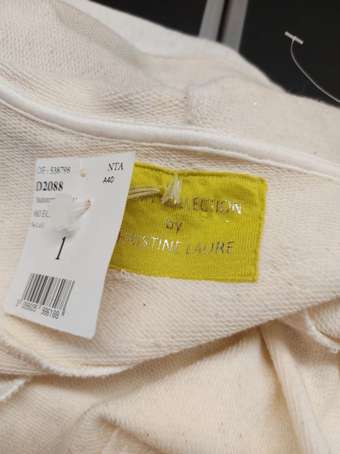 Taille 1(38) Épaule à Épaule 38 cms Largeur sous aisselles 48 cms Hauteur 60 Blanc chiné légèrement argenté Coton/polyester Fermeture par pressions Jamais portée #lestresors02_femme_38