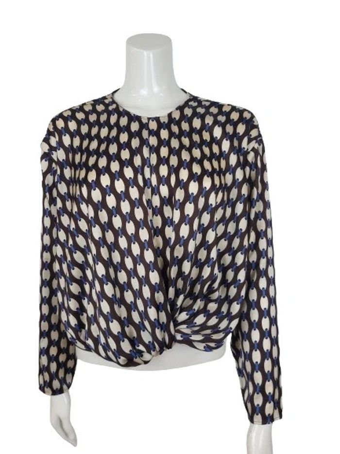 M Épaule à Épaule 44 cms Largeur sous aisselles 50 Hauteur 50 Effet satin Marron/bleu 100%polyester Très bon état #lestresors02_femme_38
