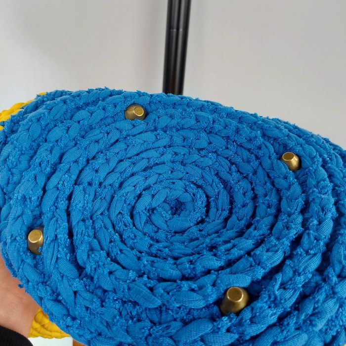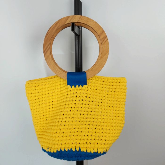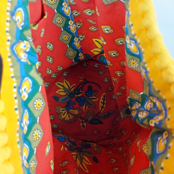 Petit sac anses bois et tissus coton tressé jaune et bleu Interieur tissu provençal Longueur 32 cms Hauteur 23 cms Très bon état