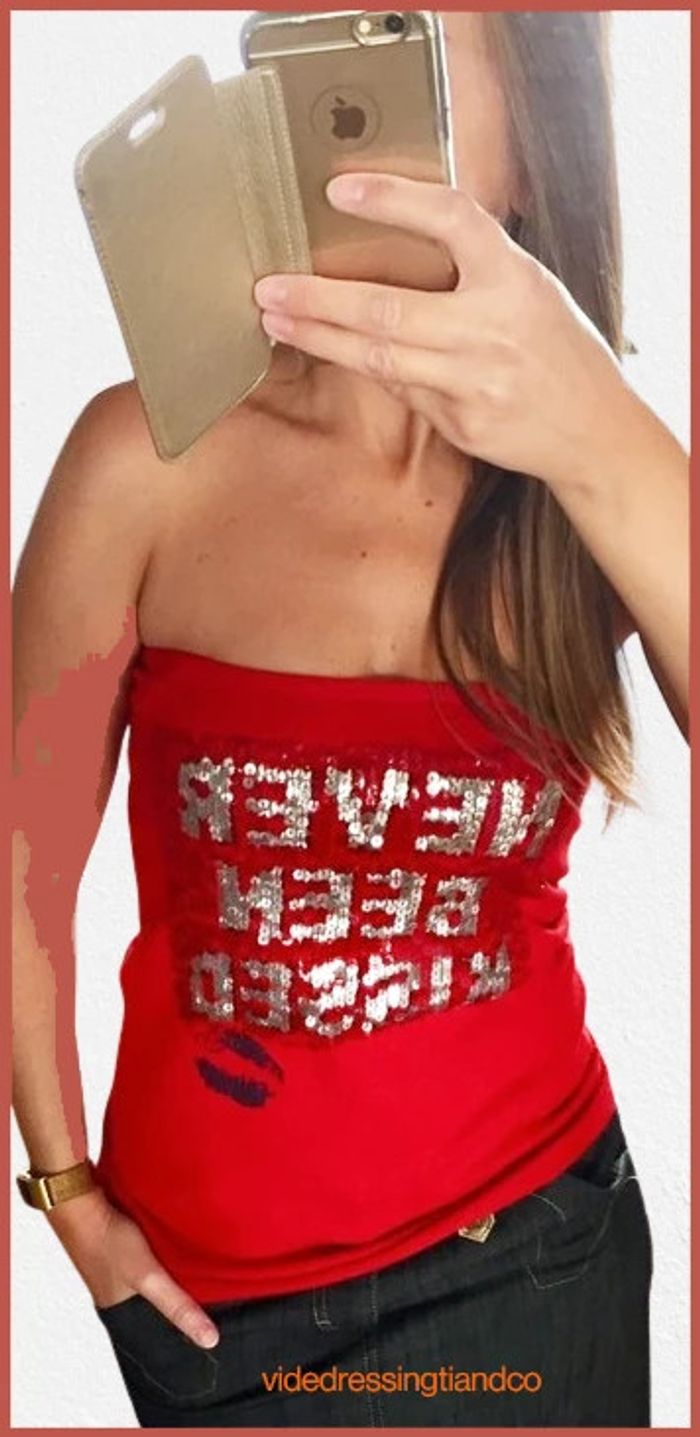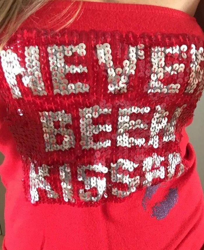Top bustier rouge en maille avec message en sequins de la marque bershka t.m, en parfait état.