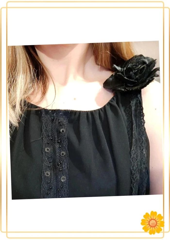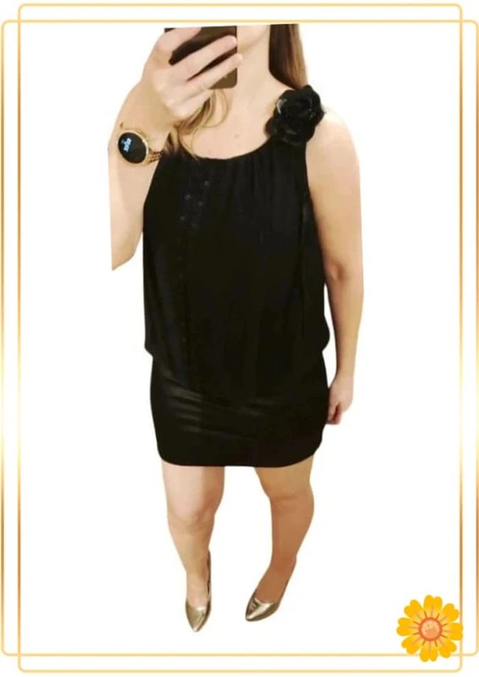 Robe noire bi-matière avec bas satiné et haut en mousseline de crêpe brodé d'un galon dentelle au milieu et d'une fleur dentelle sur l'épaule droite. Neuve jamais portée.