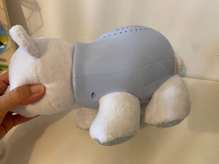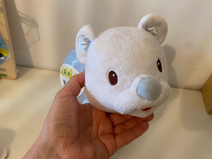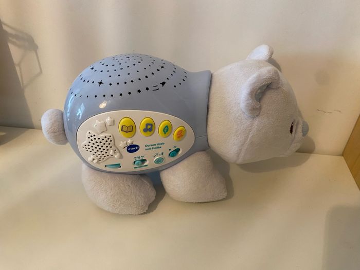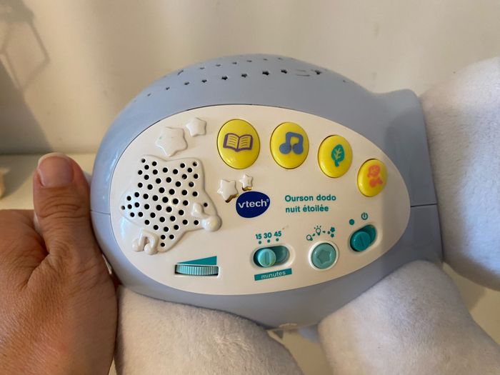 Un doudou à câliner et une veilleuse pour endormir et calmer bébé ! Cette veilleuse musicale projette des formes avec des variations de couleurs. Grâce au capteur sonore intégré, la veilleuse se déclenche automatiquement aux pleurs de bébé et l'aide à se rendormir. o Ourson dodo nuit étoilée VTECH o Comprend : une veilleuse et 3 piles LR6 AA incluses o Contenu très riche : 7 histoires, 12 sons de la nature, 60 mélodies et 3 berceuses o 4 fonctions : histoires, berceuses et mélodies, sons de la nature, sons de la nature et berceuses o Minuterie réglable de 15, 30 et 45 minutes afin de bercer bébé sans interruption. o Possibilité de désactiver la projection lumineuse pour profiter uniquement des différents sons o Réglage du volume sonore L'INFO EN + o De 0 à 6 ans o Une jolie veilleuse lumineuse et musicale pour aider bébé à s'endormir o Cette veilleuse projette des formes avec des variations de couleurs (rouge, jaune, vert et bleu) qui rassurent bébé o Si bébé se réveille et pleure pendant la nuit, la veilleuse se déclenche automatiquement pour l'aider à se rendormir o Les images animées stimulent le sens visuel o Les mélodies et les sons de la nature stimulent le sens auditif