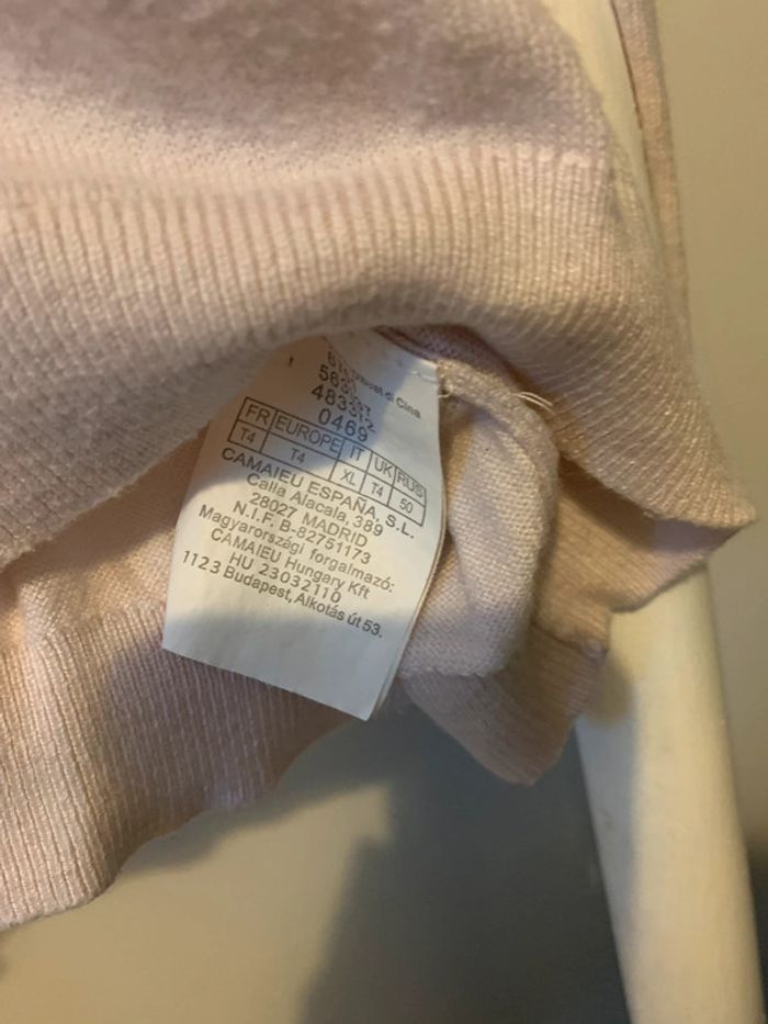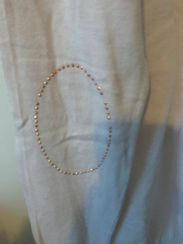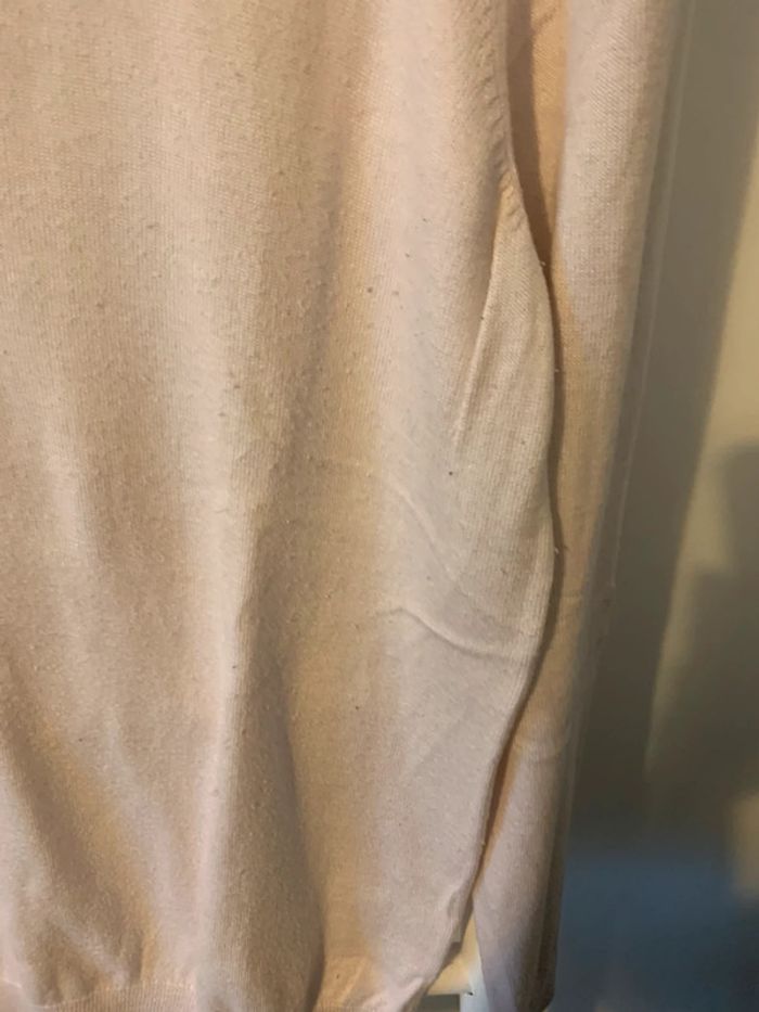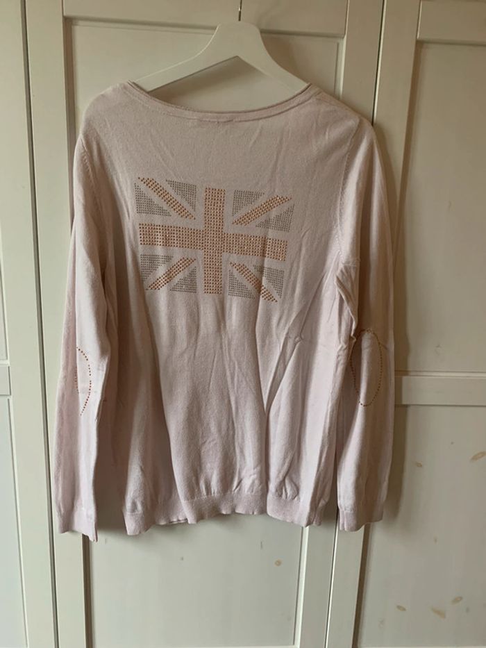 Pull rose encolure ronde strass dos et coudes Manque quelques strass au niveau coude( voir photos) Taille 4