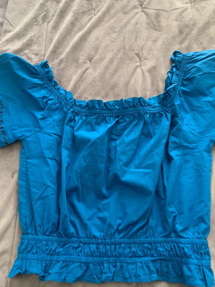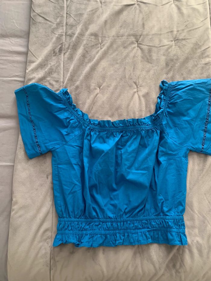 Blouse courte bleue taille élastique épaules dénudées