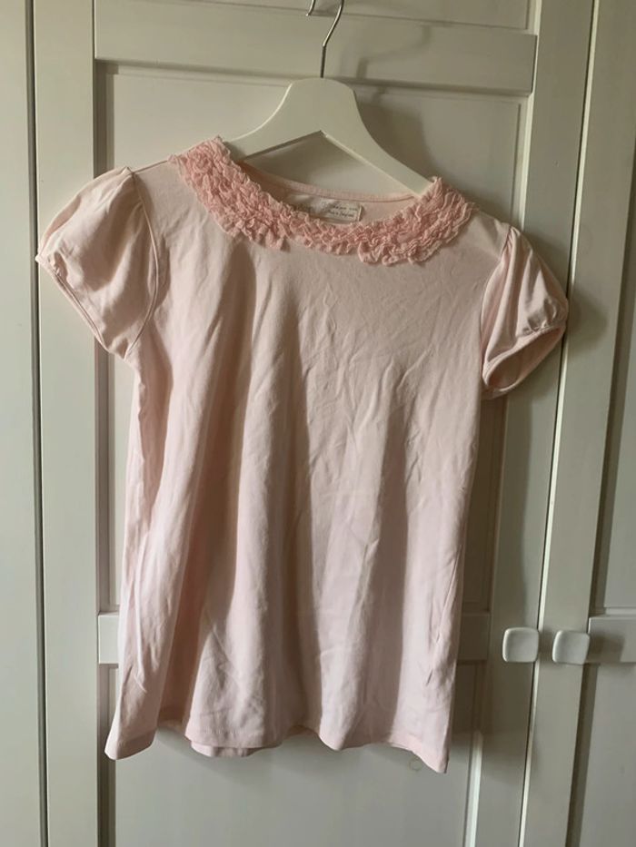 Teeshirt manches courtes rose volants à l’encolure 95% Coton 5% elasthane