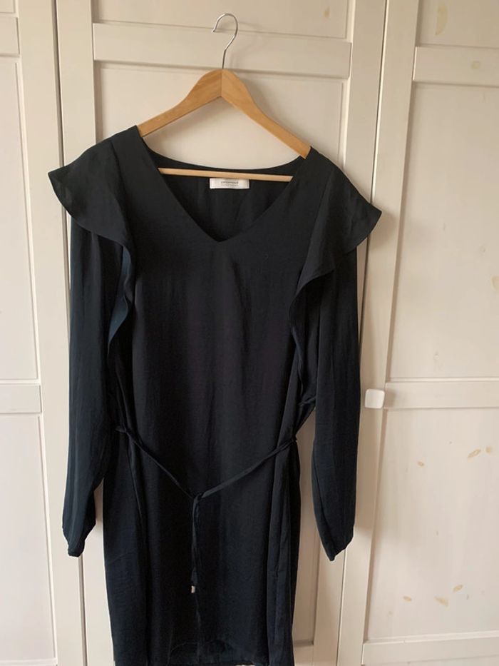 Robe noire col V épaules volants manches longues avec ceinture tres peu portée