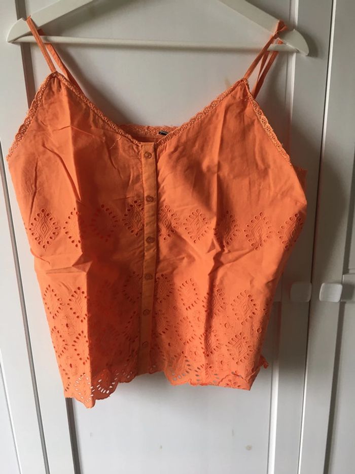haut orange à bretelles réglables et broderie anglaise