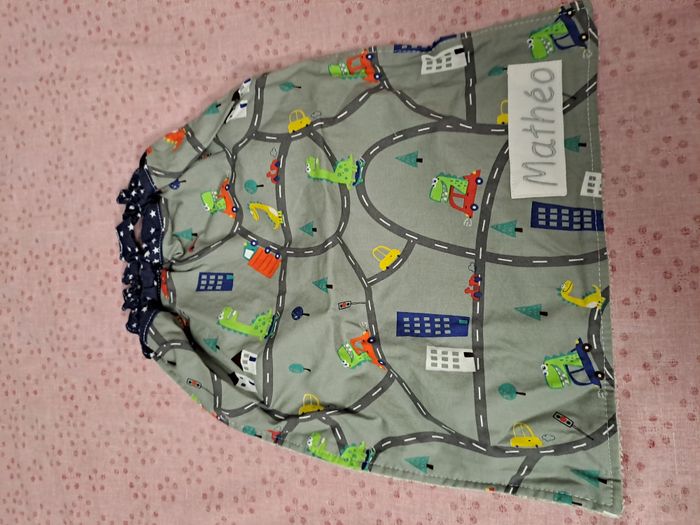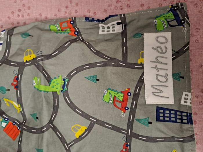 Bavoir élastique avec Prénom "Mathéo" brodé. J'ai acheté ce bavoir (sur un site de créateurs bien connu) à une vendeuse qui les fait main. On voit que c'est de la qualité et très bien fait. Je pensais en avoir besoin pour une occasion et au final non et après les avoirs bien rangé, je l'ai oublié et retrouvé récemment. J'ai ai acheté plusieurs de différents coloris, j'en ai en vente sur d'autres annonces du coup. Motif routes. Matière tissus et éponge de bambou. Neuf, jamais utilisé.