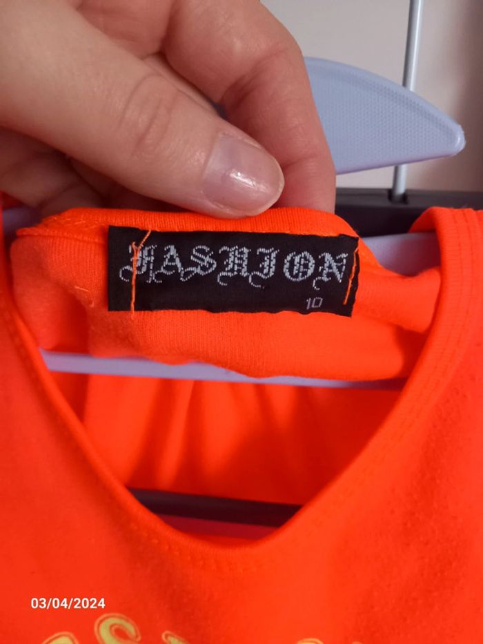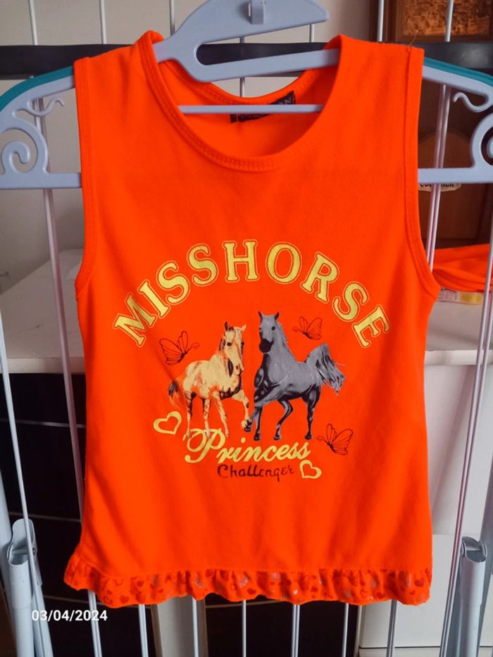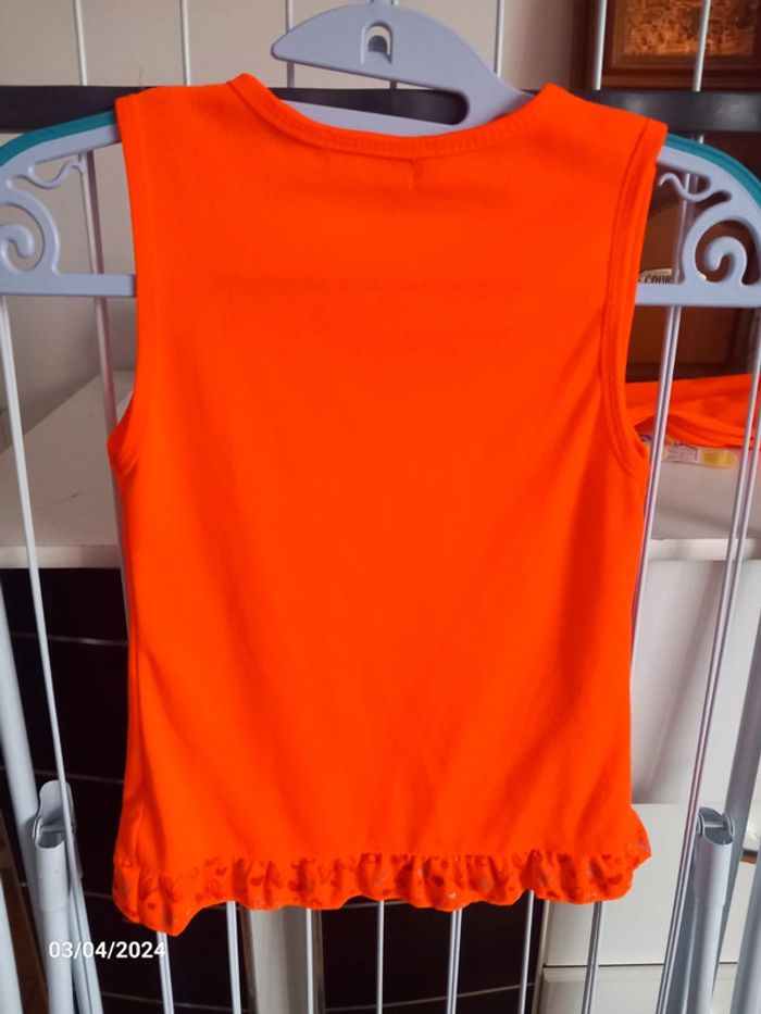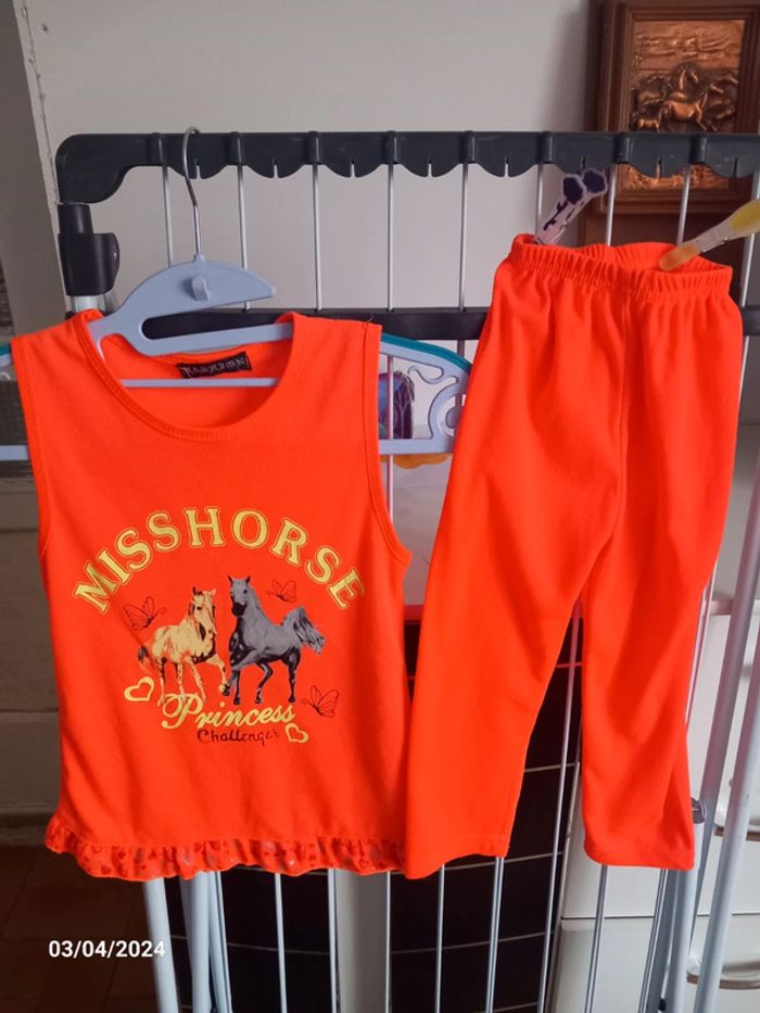 Ensemble composé de une tunique et un leggings court . De couleur orange. Motif chevaux . En parfait état. Taille 10 mais petit plus un 9 #alex08380_9_10ansfille