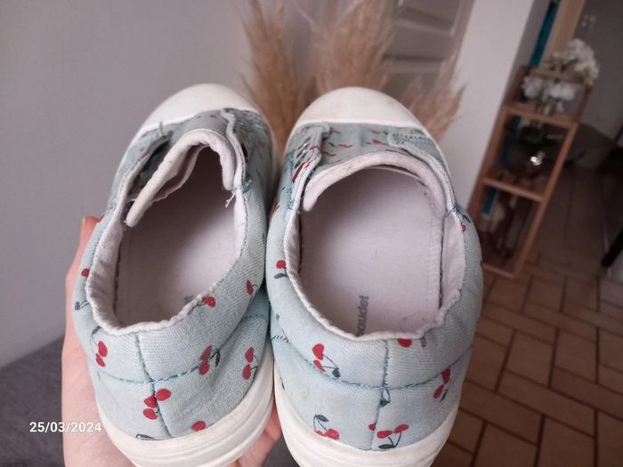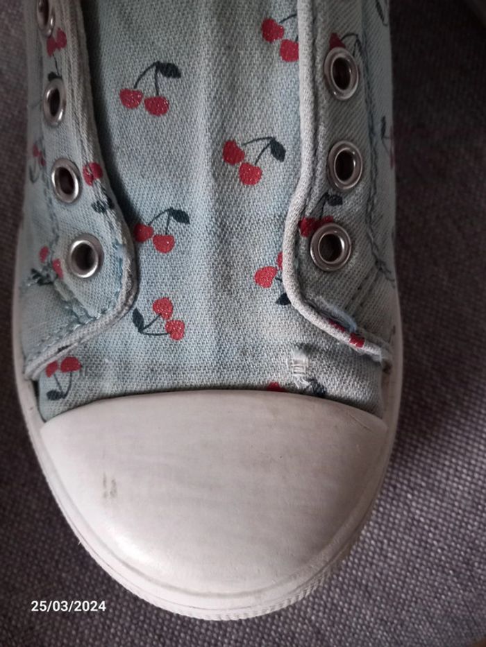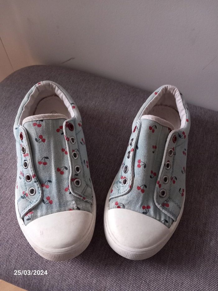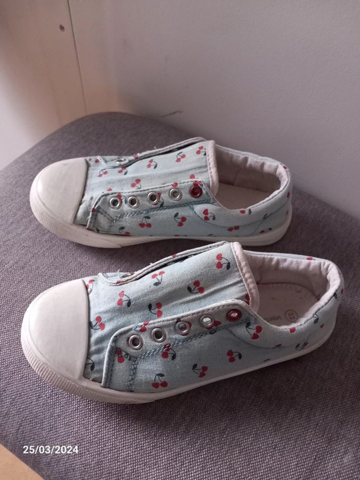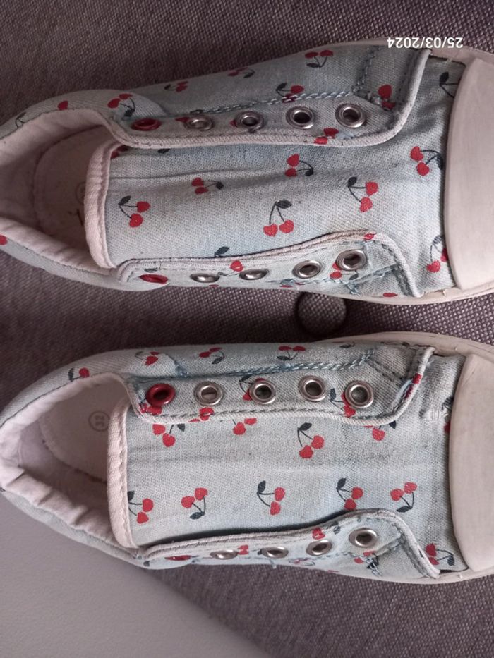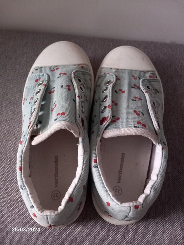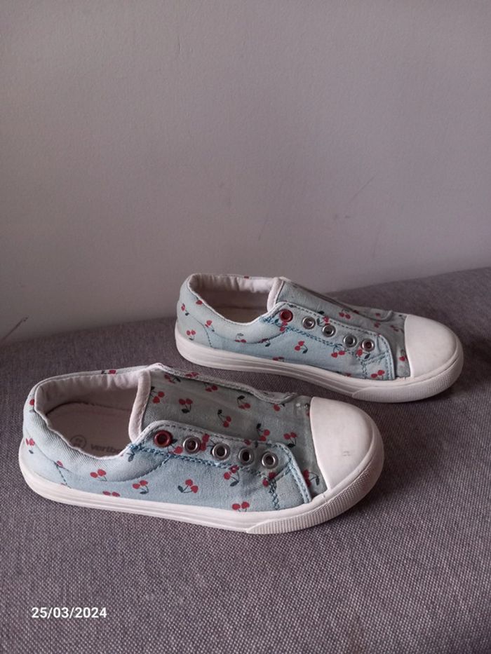 Chaussure . De couleur bleu ciel . A motif cerise . Style sans lacets. En parfait état casiment pas était mise ( juste petit acro sur le haut d'une chaussure voir photo ) . Marque vertbaudet. Pointure 32 . #alex08380_chaussure32fille