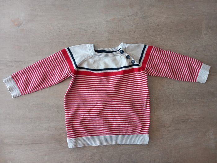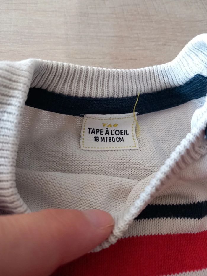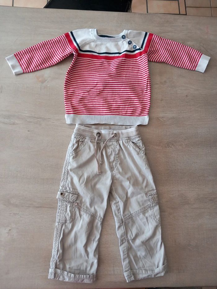 Ensemble de vêtements composé de : - 1 pull . Beige a rayures rouge . Ouverture a bouton sur l'épaule . Marque tape à l'œil. - 1 pantalon. Beige . Taille élastique et Réglable grâce au cordon. Marque gémo. En bonne état . Le pull a une petite tâche en haut du col mais se voit quasiment pas. Taille 18 mois. #alex08380_18moisgarçon