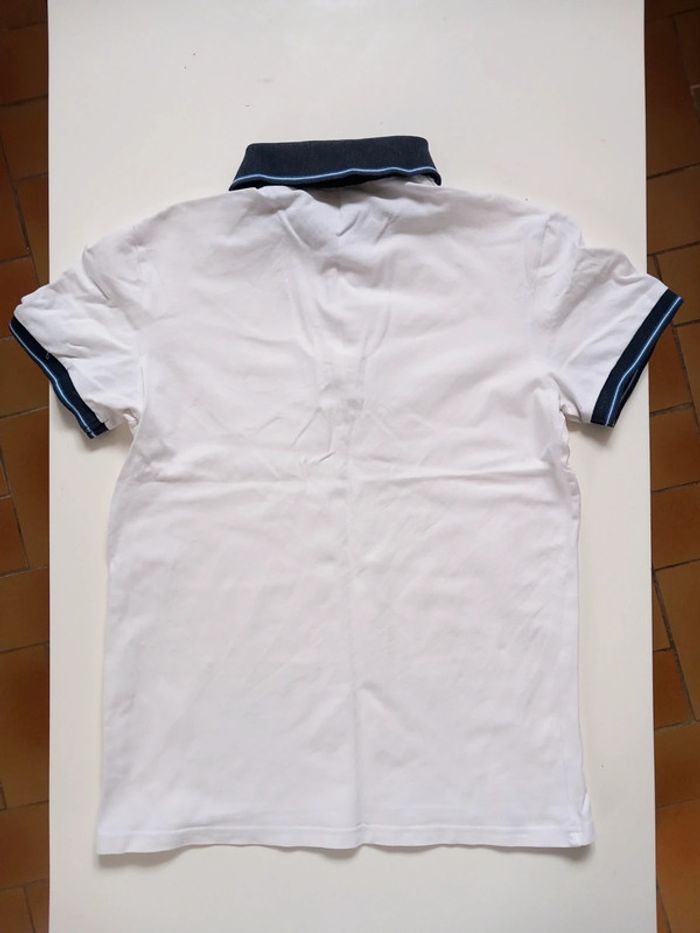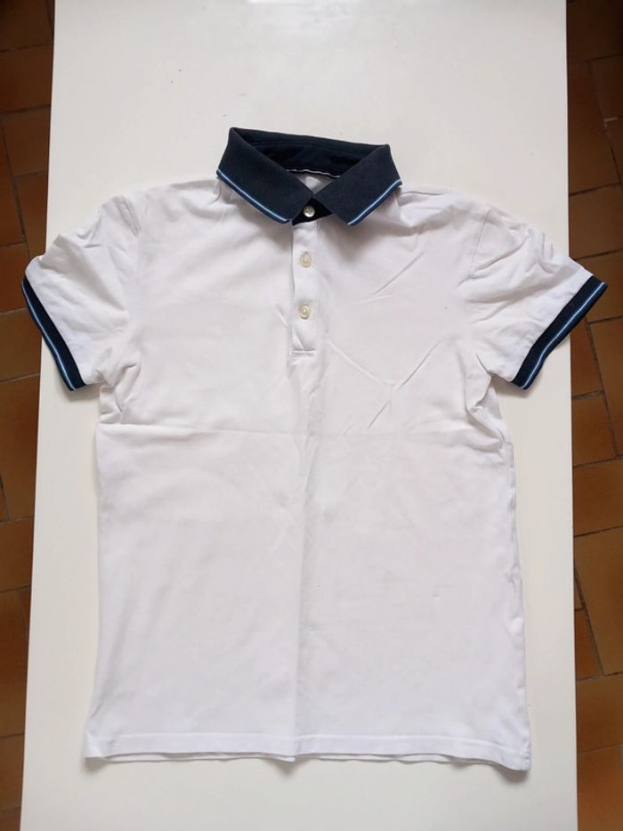 Polo fin . Blanc avec un col et le bout des manche marine . Ouverture a bouton devant. Taille S En parfait état. #alex08380_S_homme