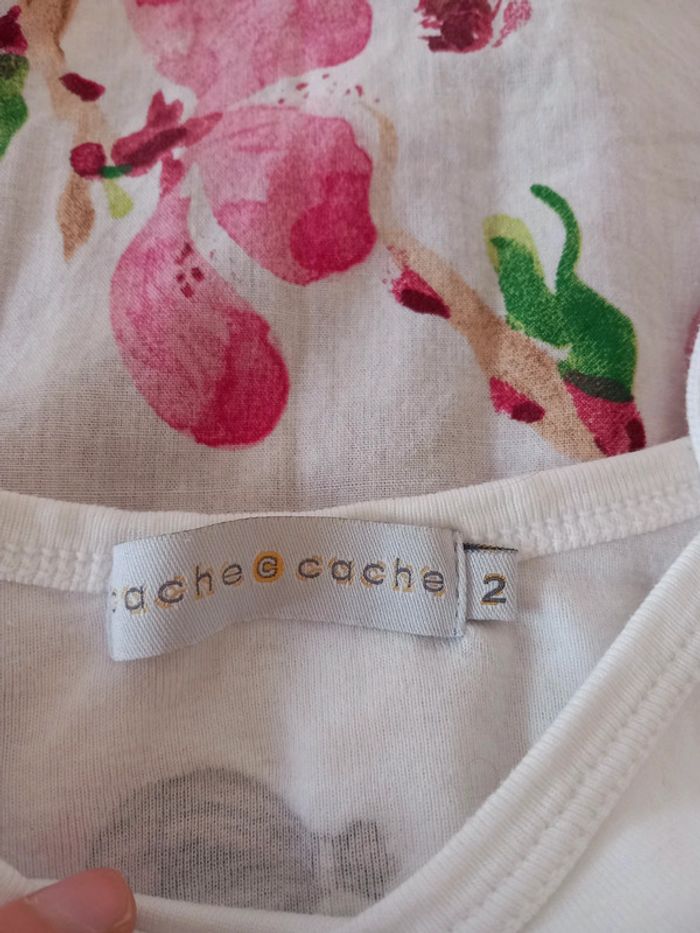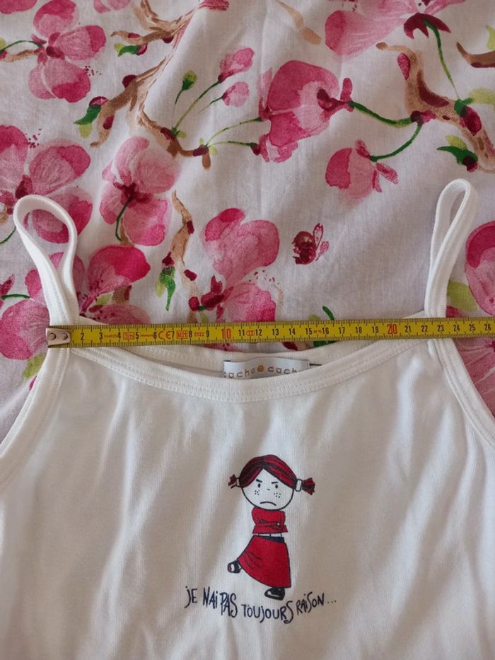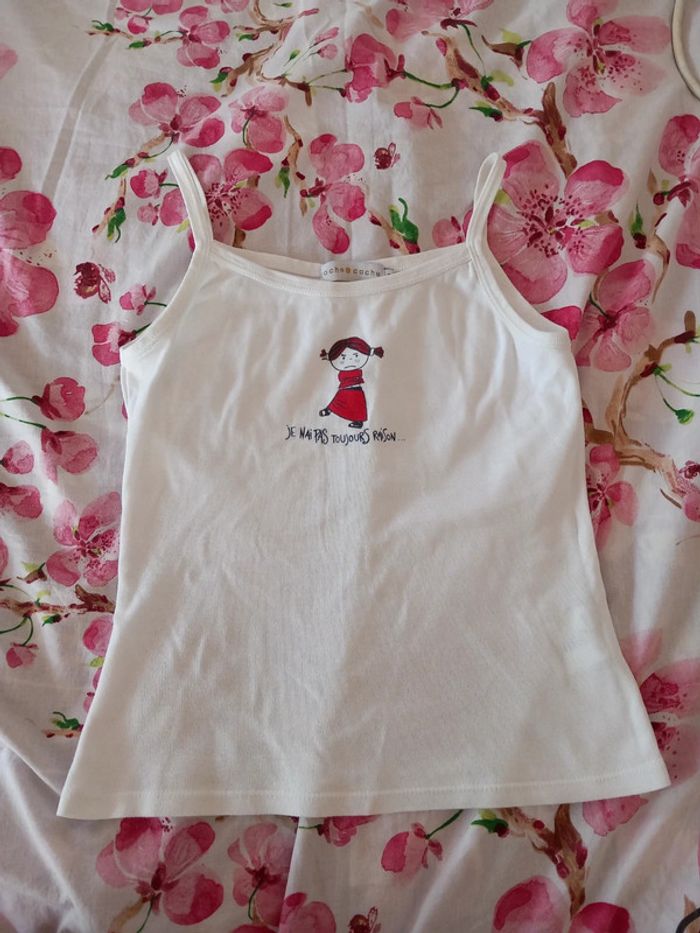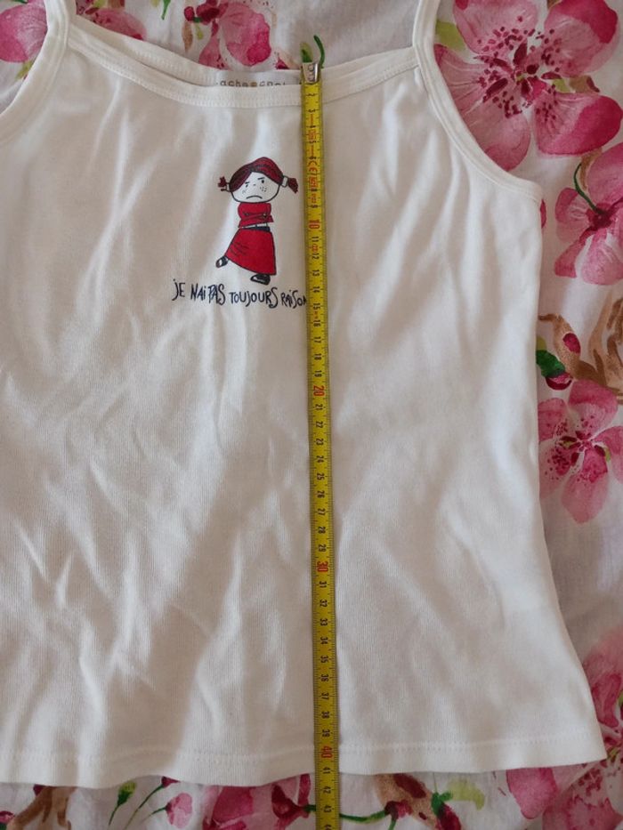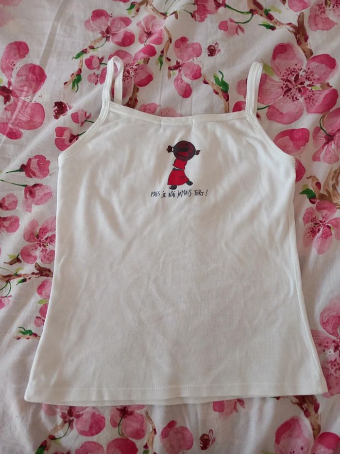Débardeur. Blanc. Fin . Avec dessin d'une fille sur le devant et derrière. Taille 2 . 100% coton . Largueur : 23.5 cm Longueur : 41 cm . #alex08380_38