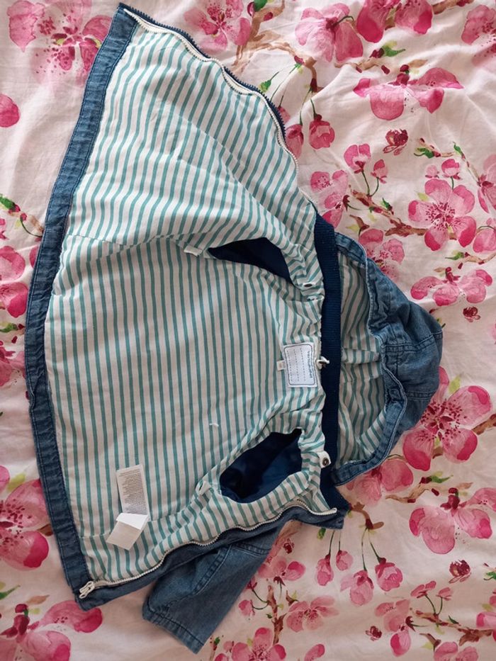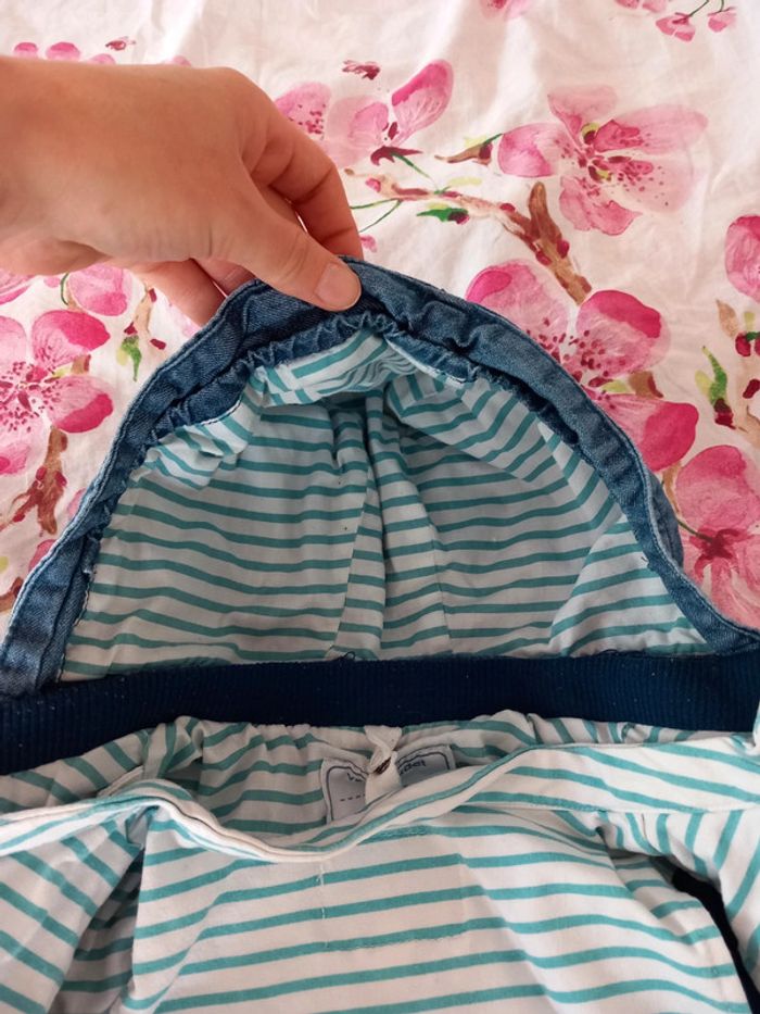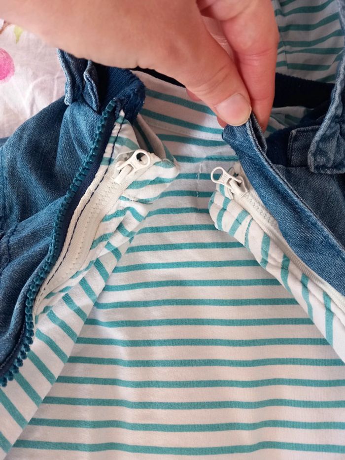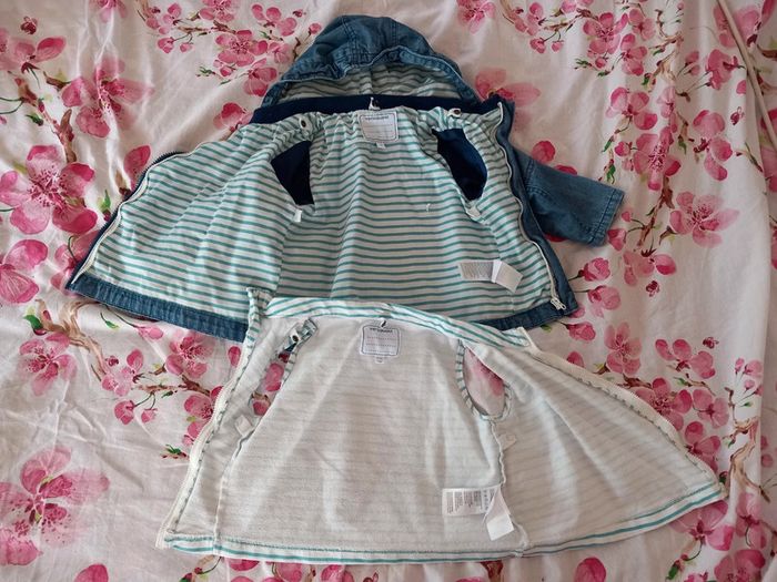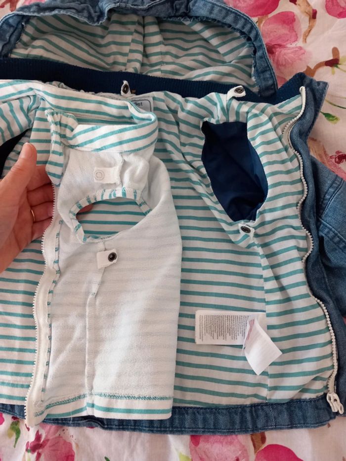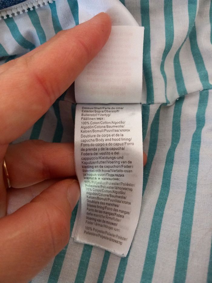 Manteau 2 en 1 . Composer de : - une doudoune très fine et légère. A rayures vert et blanche. A fermeture éclair. 100% coton . - une petite veste fine . En jeans . Avec capuche. Fermeture éclair. Poche sur le devant . La capuche peut se retirer Les 2 se fixe grâce a des boutons pression et des fermeture éclairs . Voir les photos . En parfait état. Taille 12 / 18 mois . Marque vertbaudet. Le style de la fermeture éclair n'est pas droite. #alex08380_12moisgarçon