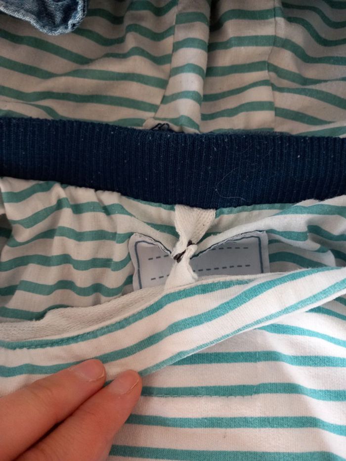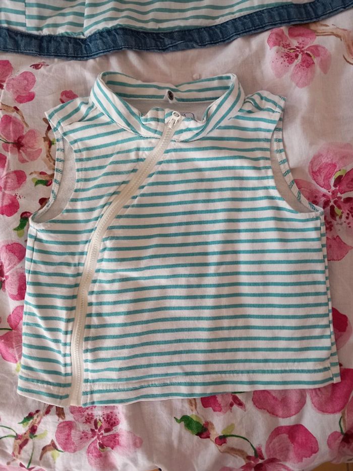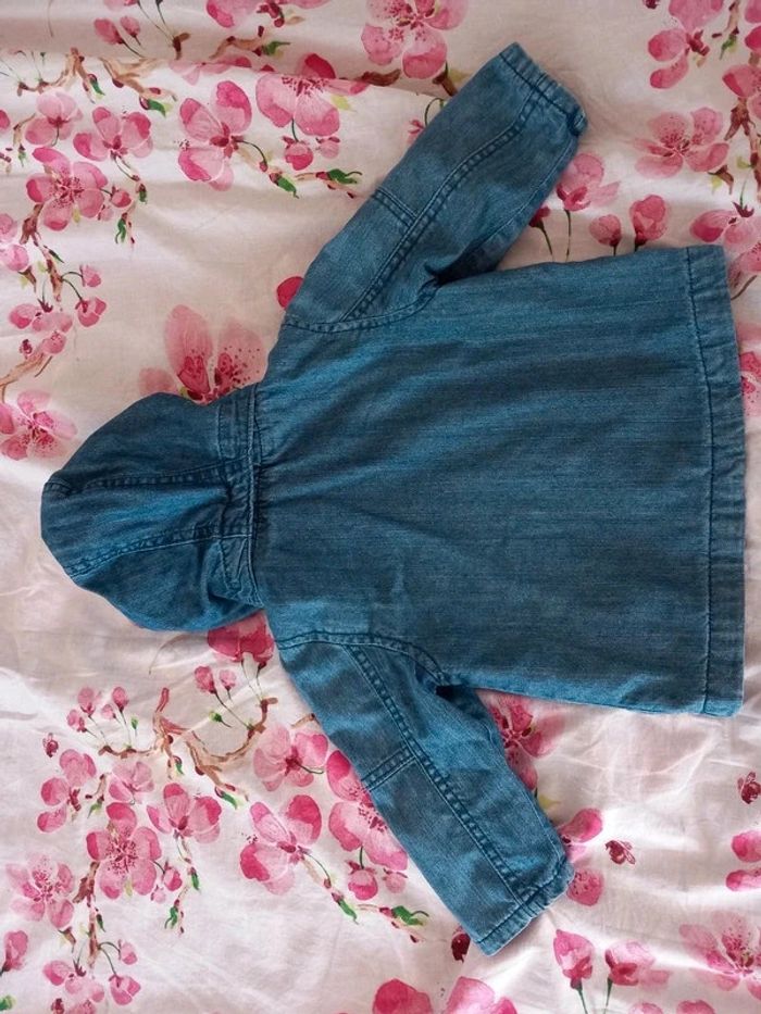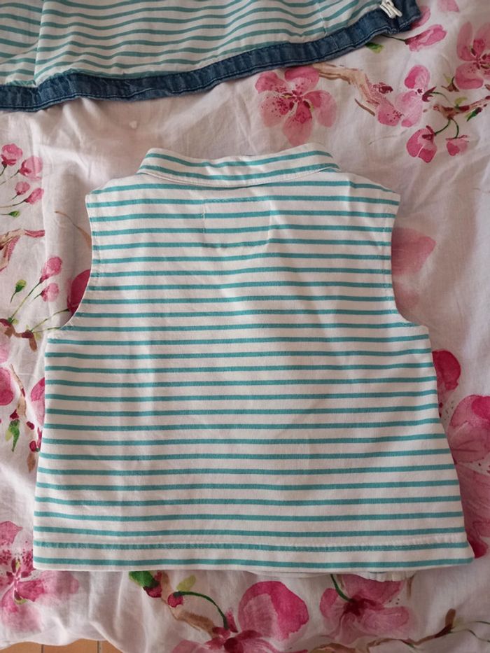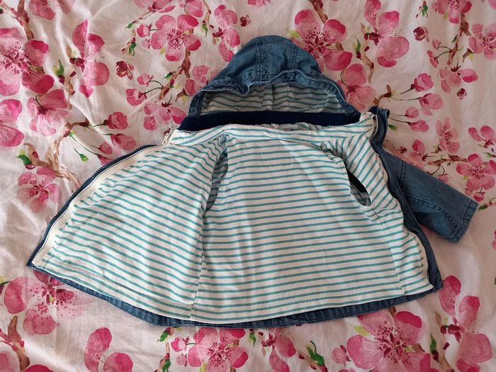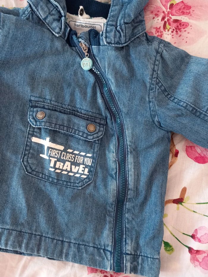 Manteau 2 en 1 . Composer de : - une doudoune très fine et légère. A rayures vert et blanche. A fermeture éclair. 100% coton . - une petite veste fine . En jeans . Avec capuche. Fermeture éclair. Poche sur le devant . La capuche peut se retirer Les 2 se fixe grâce a des boutons pression et des fermeture éclairs . Voir les photos . En parfait état. Taille 12 / 18 mois . Marque vertbaudet. Le style de la fermeture éclair n'est pas droite. #alex08380_12moisgarçon