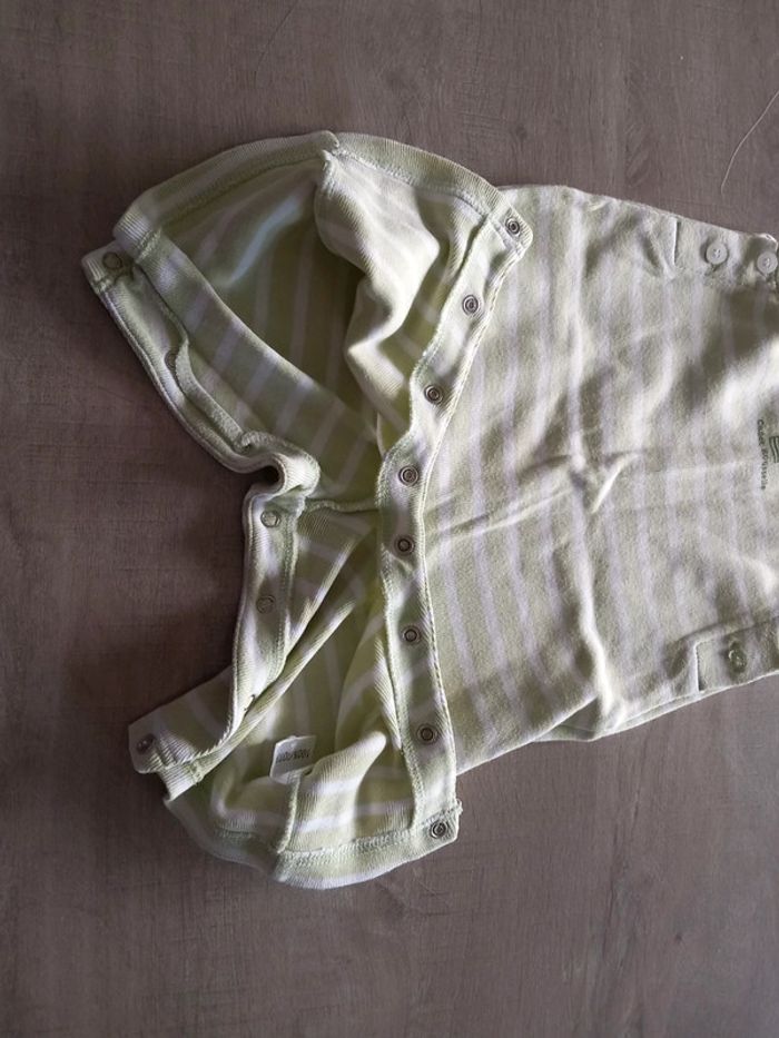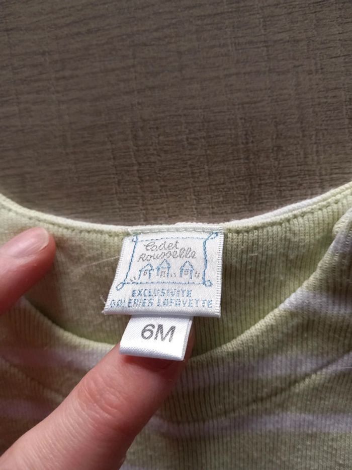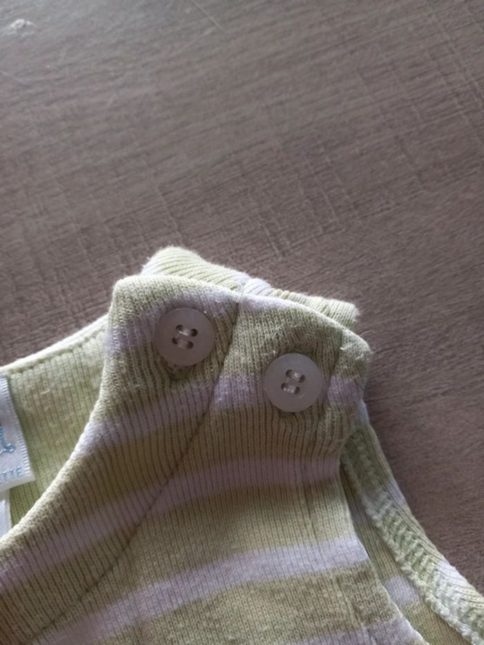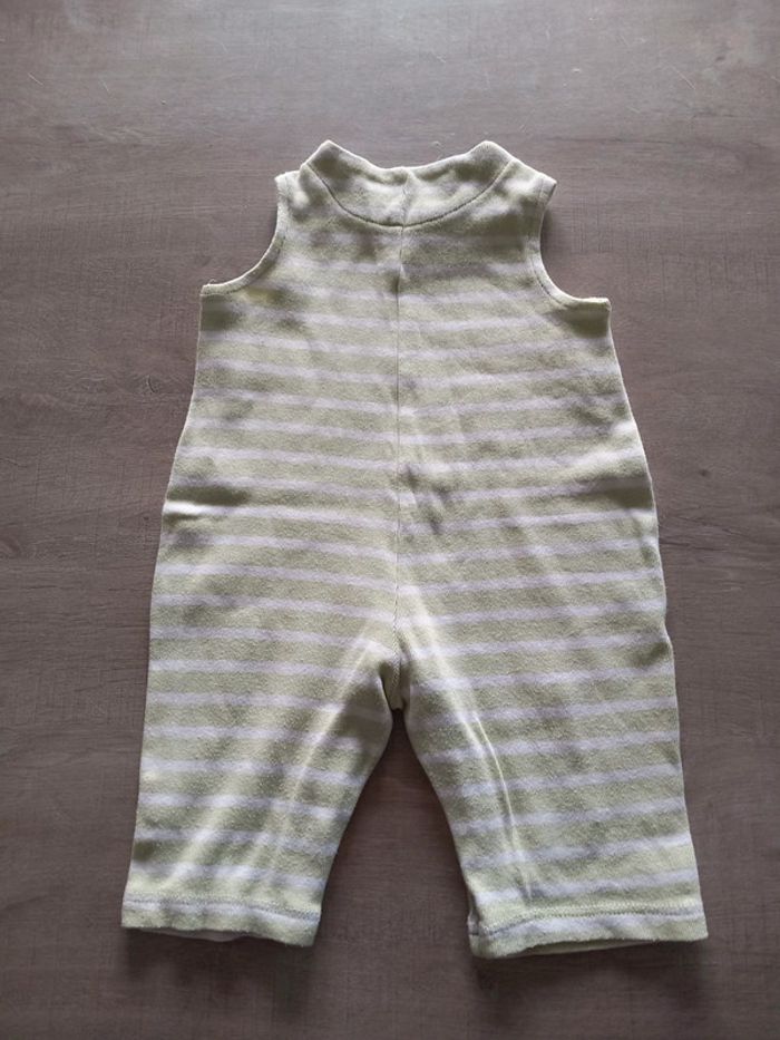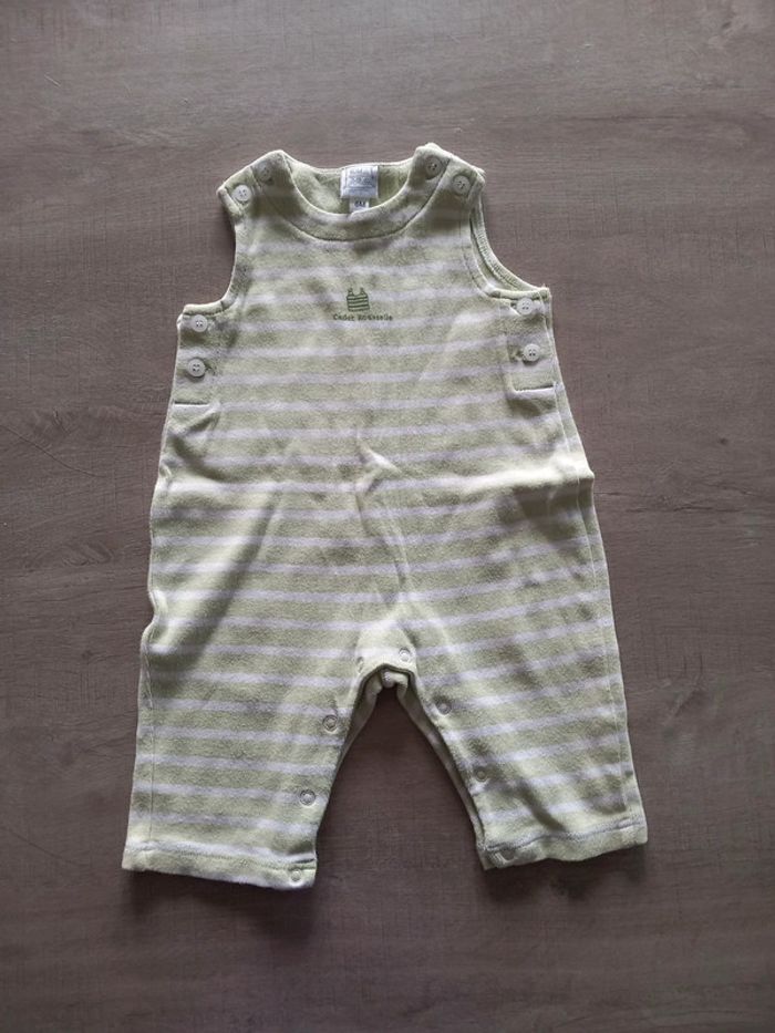 Salopette en 6 mois . Vert clair à rayures blanches. Ouverture a bouton sur les côtés et aux bretelles. Ouverture à pression entre les jambes. 100% coton Marque galerie lafayette #alex08380_6moisgarçon