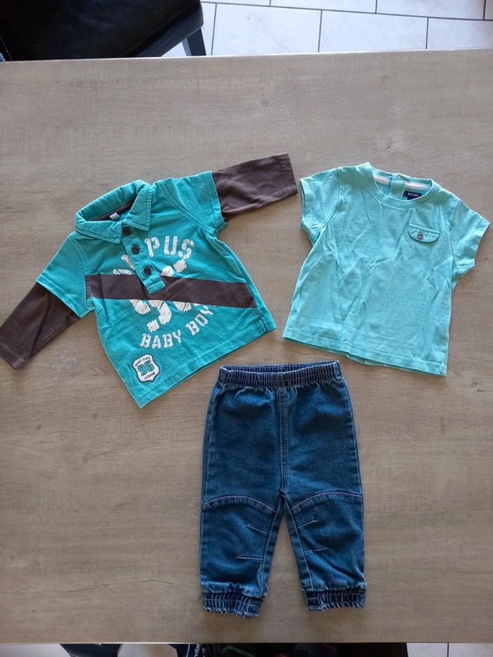 Lot de vêtements en 6mois composé de : 🔹️un jeans. Bleu . Serrant aux chevilles. Taille élastique. 70% coton et 29% polyester. Marque intermarché. 🔹️un sweat vert et marron. Ouverture Bouton sur le devant . Petit col . 61% coton et 39% polyester. Marque intermarché 🔹️un t-shirt. Turquoise . Ouverture complète par pression derrière. 100% coton . Marque kiabi #alex08380_6moisgarçon