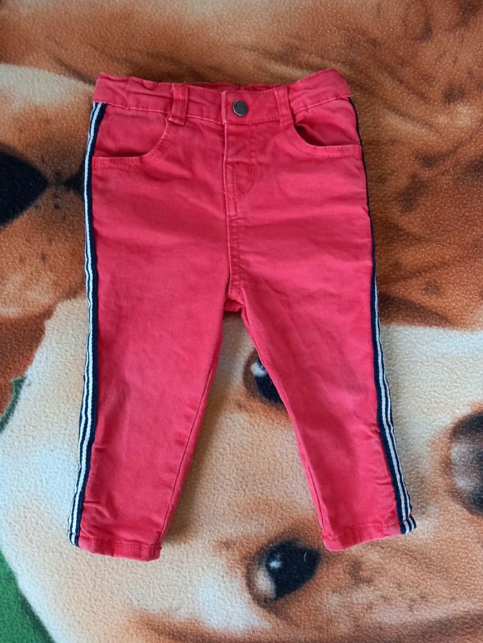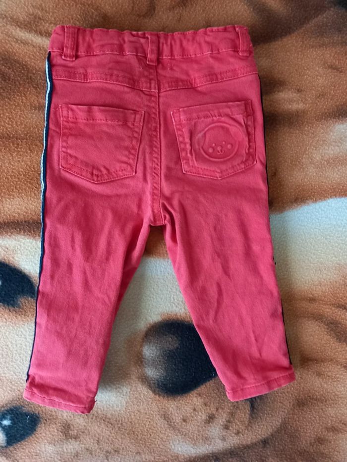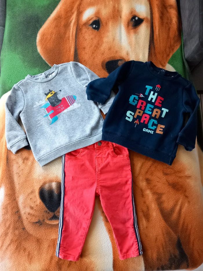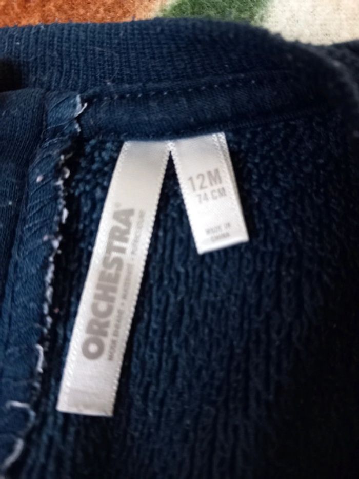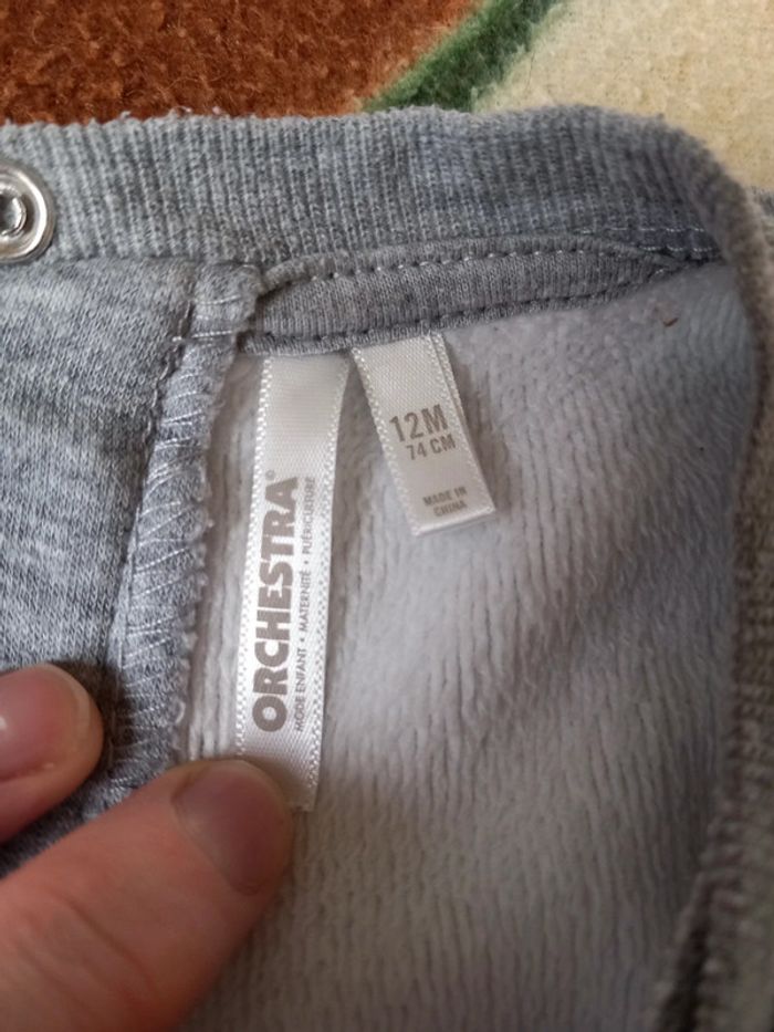 Ensemble de vêtements en 12 mois composé de : Un pull chaud gris . Pression derrière Un pull chaud marine. Pression derrière Un jeans slim corail avec des bandes sur les côtés . Réglable a la taille. Marque orchestra . #alex08380_12moisgarçon