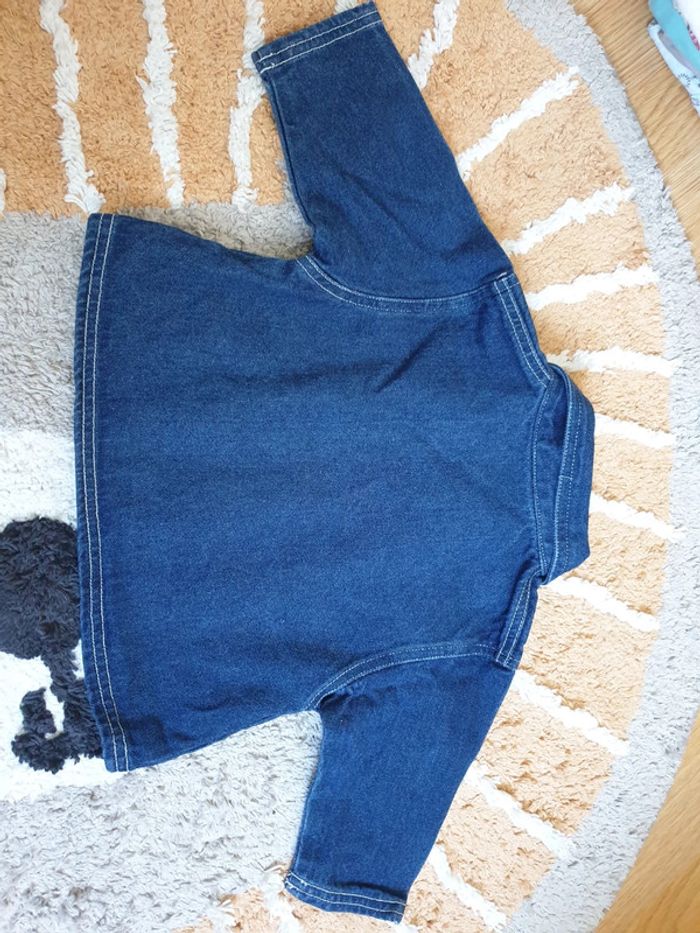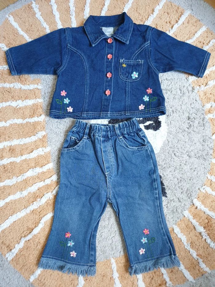 #alex08380_6moisfille Ensemble veste et pantalon en jeans avec motif des fleurs . Froufrou en bas des jambes Taille 6 mois .