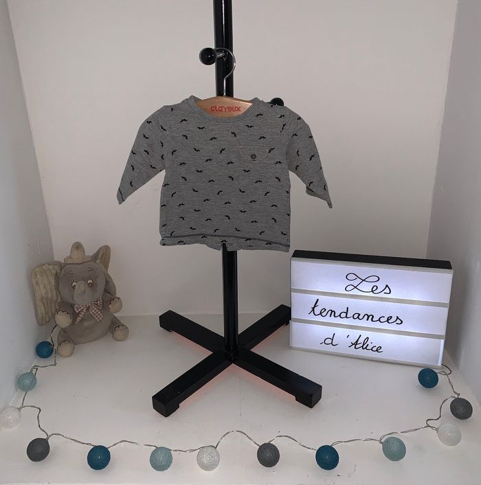 Petit tee-shirt manche longue gris imprimé moustache Kiabi Avec pression dans la dos 3 mois Porté 1fois