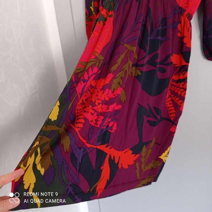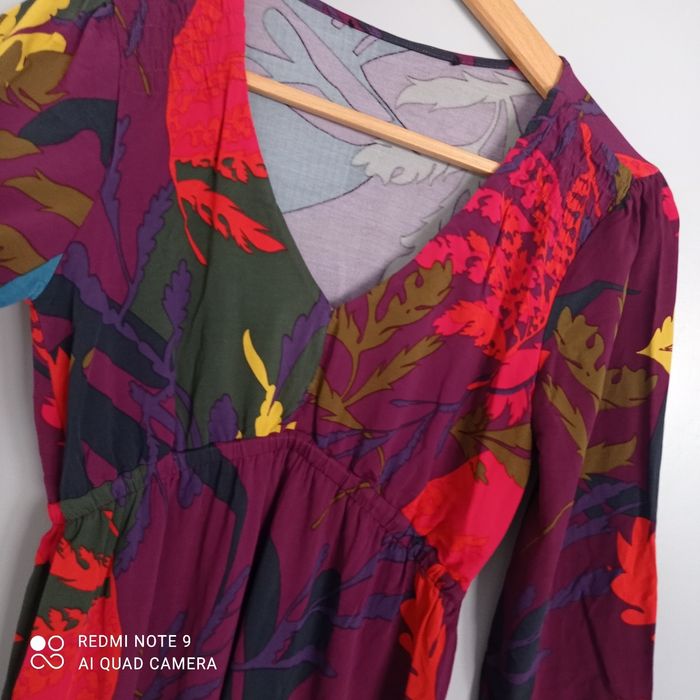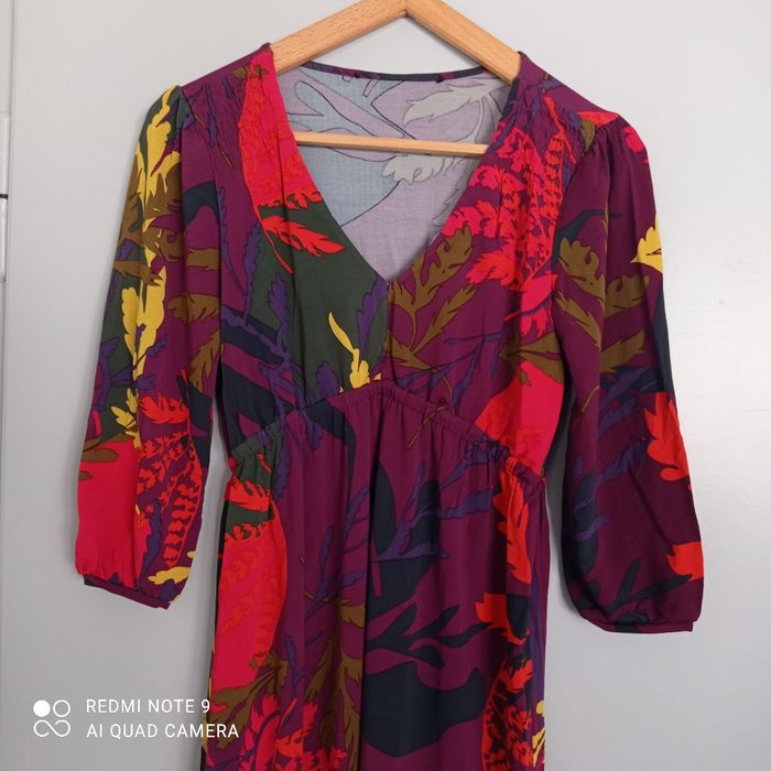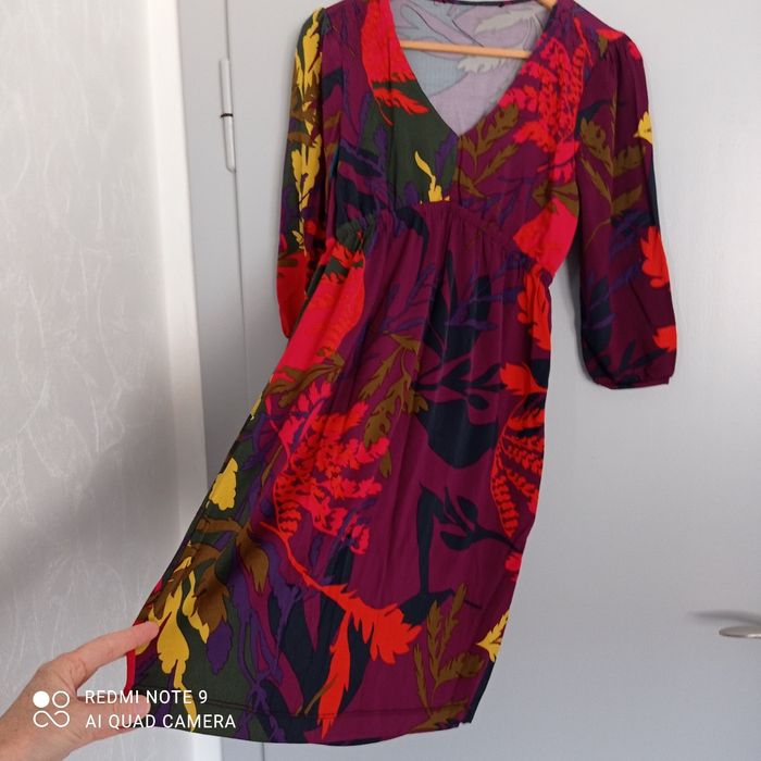 Jolies couleurs. Col en V. Revers décousu sur quelques cm à l' intérieur voir photos. Ne se voit pas porté. Taille estimée. Voici les mesures prises à plat : épaules : 38cm, aisselles : 41cm, longueur : 90cm. C1