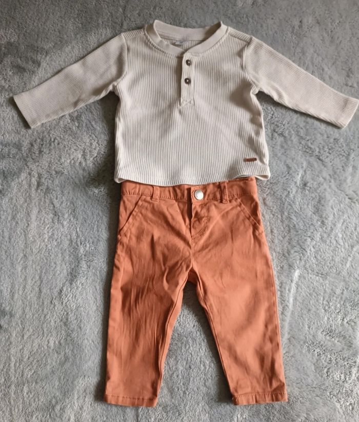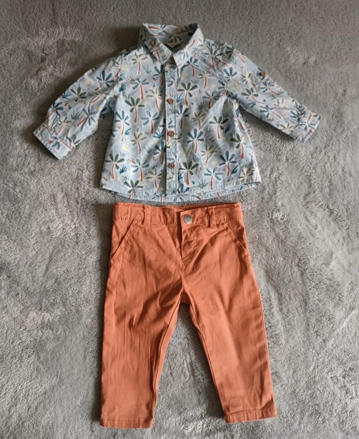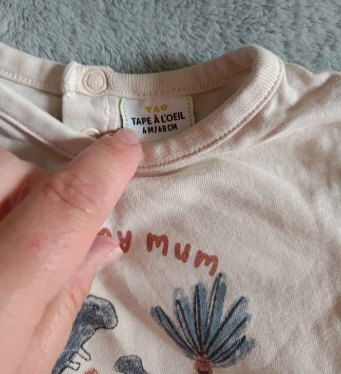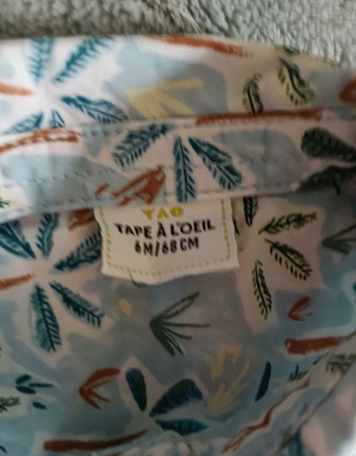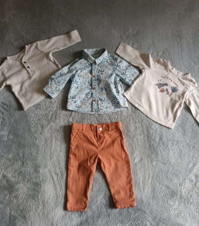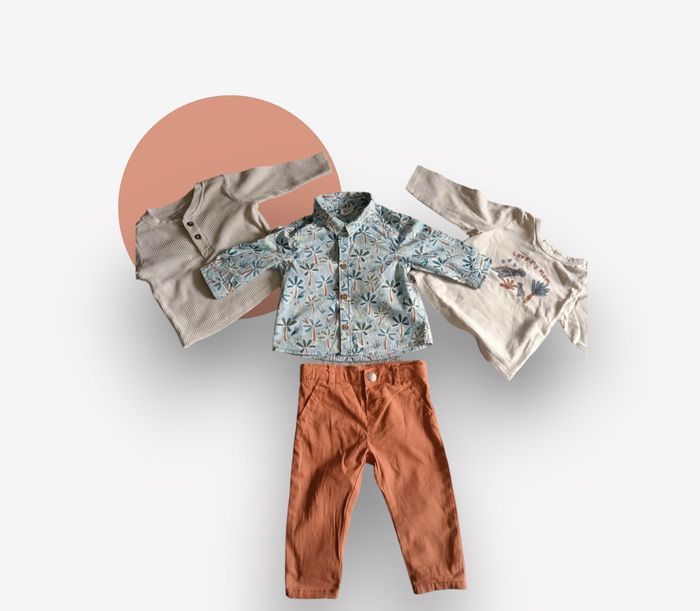 Lot 6mois composé -D'une chemise de marque tape à l'oeil avec imprimé arbre valeur neuve 16€99 -D'un t-shirt manche longue avec imprimé dinosaure ''love my mum'' de marque tape à l'oeil valeur neuve 7€90 -d'un t-shirt beige de marque zeeman matière très agréable valeur neuve 5€90 Et d'un pantalon de marque Zeeman couleur rouille d'une valeur neuve 8€90 Le tout d'en un super état valeur neuve du lot 39€69 Pensez à faire des lots les remises sont activés. Dressing moderne et à petit prix