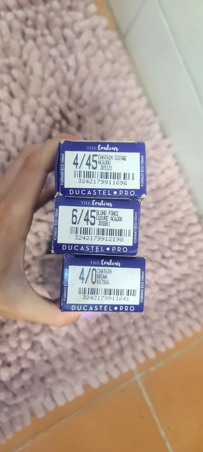 3 lots de couleur professionnelle pour cheveux. Acajou châtain cuivre 4/45 Châtain brun 4/0 Blond foncé cuivre acajou 6/45 Peut être vendus séparément