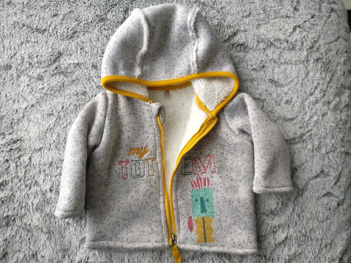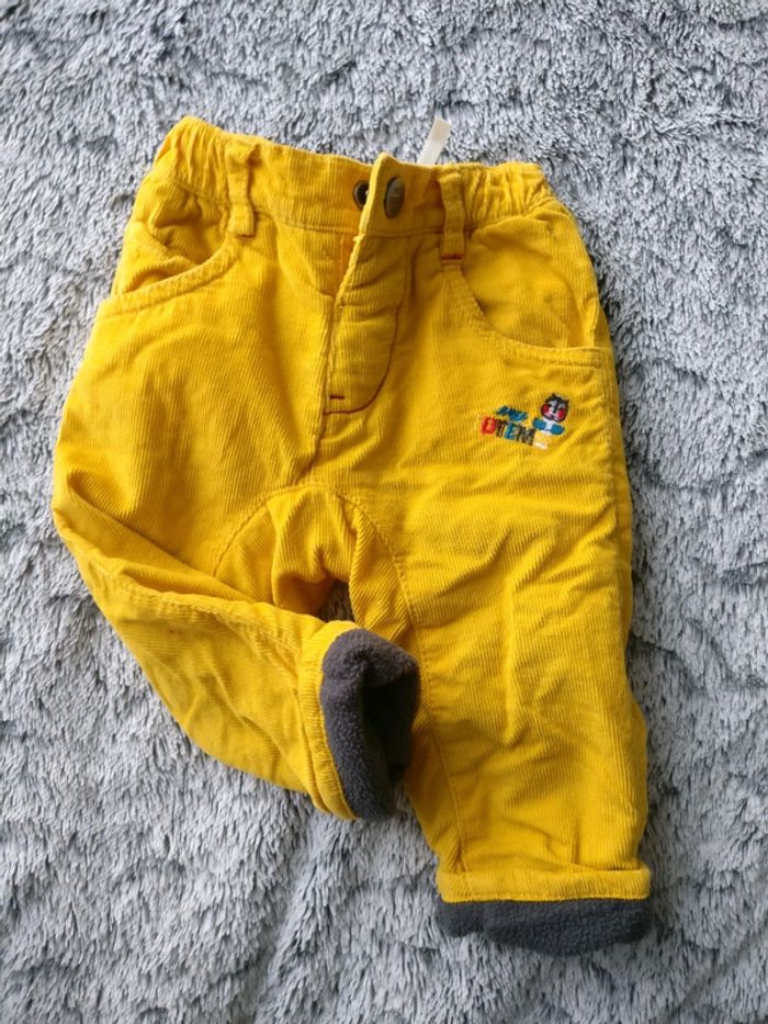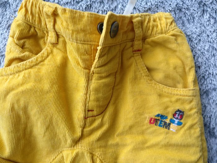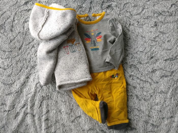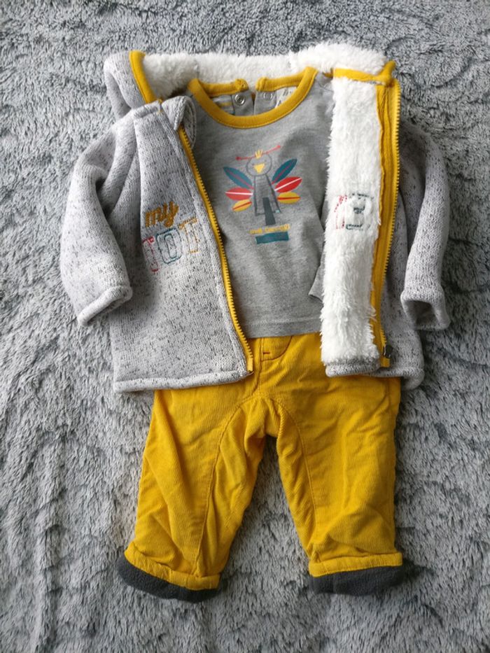 Ensemble composé : - d'un tee-shirt body - d'un pantalon en velours jaune doublé polaire - d'un gilet zippé fourré à capuche Pour voir les autres articles de la même taille : #sabristi35garçontroismois