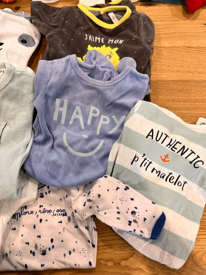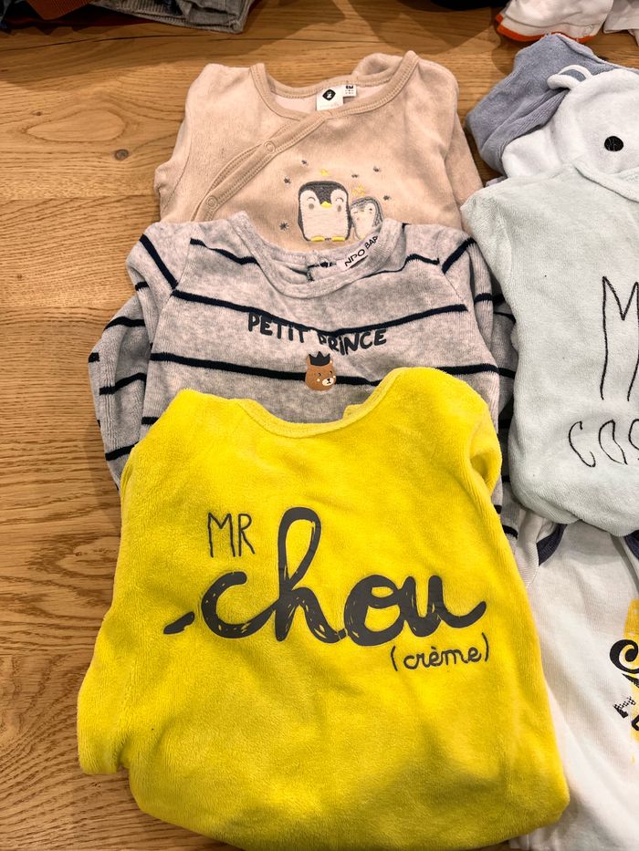 2 pyjamas velours kiabi 1 pyjama léger kiabi 1 pyjama velours taché au pied (voir photo) marque inconnue 2 velour NPO baby 1 velour gemo 1 velour grain de blé 1 body manche courte absorba 1 body manche longue marque inconnue