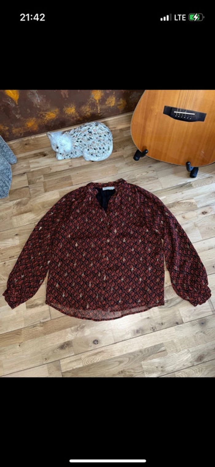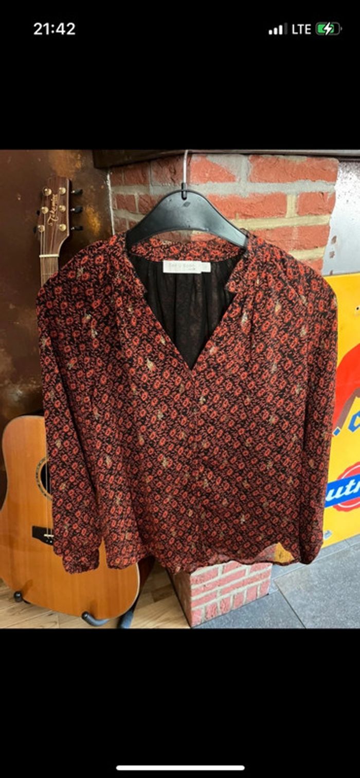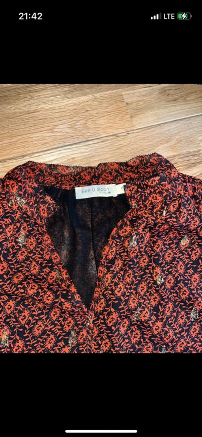 Blouse noire motifs oranges et dorés See u soon Comme neuve portée une fois 36 N’hésitez pas à faire un tour dans mon dressing je fais des prix sur les lots ☺️