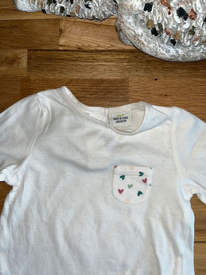 Joli t-shirt crème détails petits cœurs poche TAO Très bon état 6 mois/68 cm N’hésitez pas à faire un tour dans mon dressing je fais des prix sur les lots ☺️