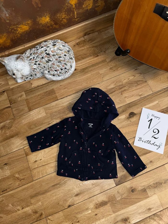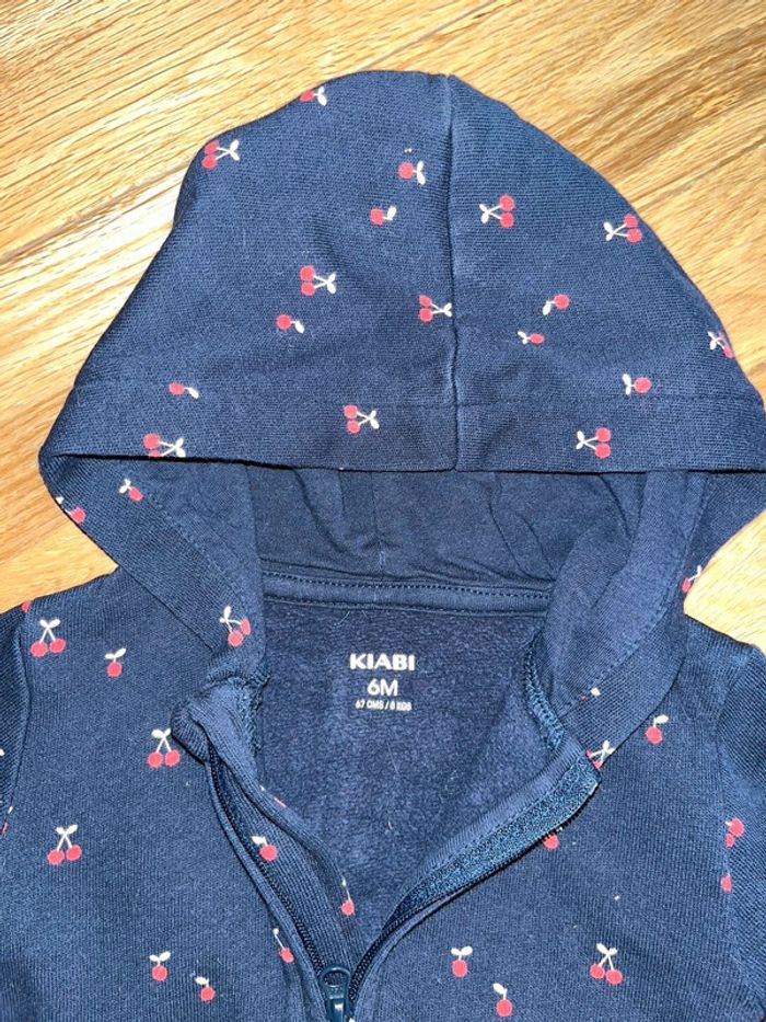 Sweat bleu motifs cerises Kiabi Très bon état 6 mois N’hésitez pas à faire un tour dans mon dressing je fais des prix sur les lots ☺️