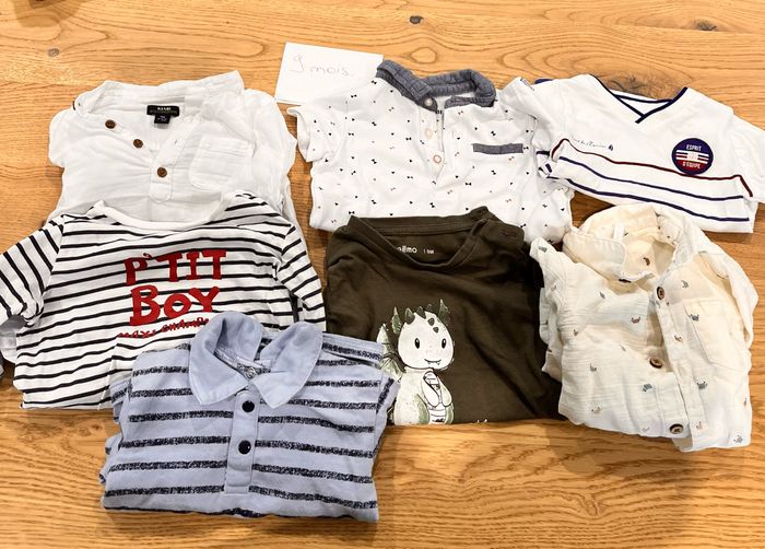 Chemise orchestra TEE shirt pat & ripaton TEE shirt gemo 1 polo les bébé c’est comme ça 1 polo kiabi 1 tee shirt terre de marins 1 chemise légère kiabi