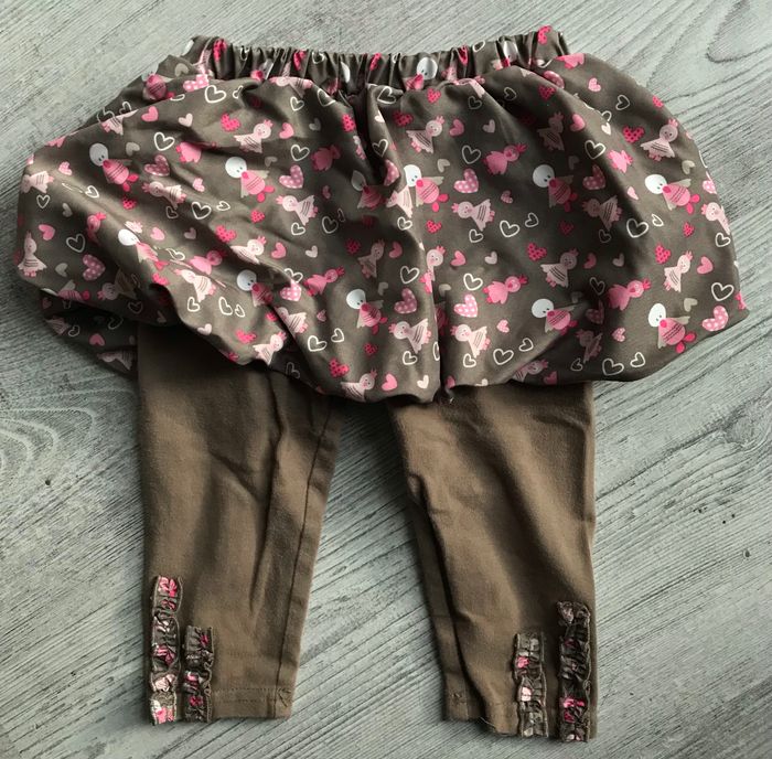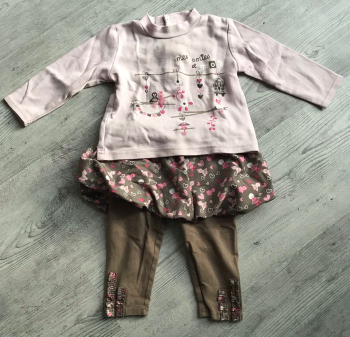 ensemble tee shirt à manches longues et legging/jupe (2en1) taille 12 mois couleurs rose et marron clair légères traces d’utilisation occasion, bon état